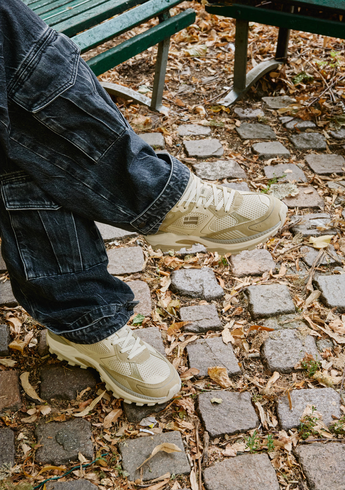 Our model 347 features a chunky aesthetic. Its high-density nylon mesh combines with different finishes and beige tones. It showcases our flag on one side and also features an adjustable lace closure.