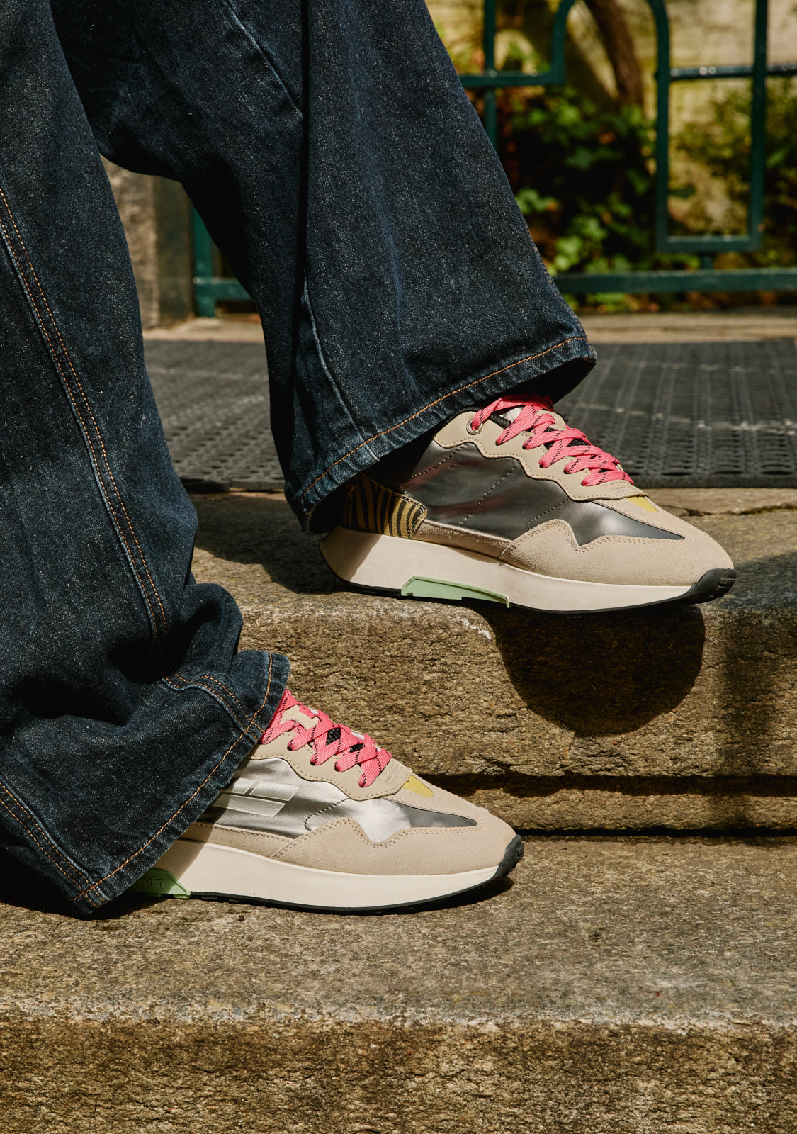 This model fuses different textures with silver and pink tones that highlight its uniqueness. It features the D.Franklin flag on the side and printed laces for a perfect fit. In addition, it has a two-density sole. The first one is made of recycled materials for a comfortable and light tread, and the second one is embossed to provide grip.