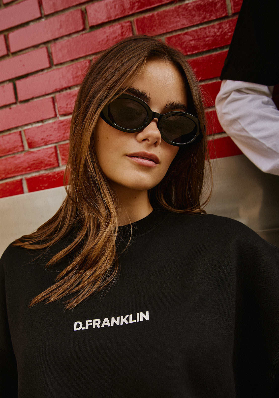 Our Capri model in black has the distinctive D.Franklin details, the logo engraved on the temples and the emblem on the lens. The lens width is 53 mm and the front is 150 mm. The side temples have a length of 145 mm.