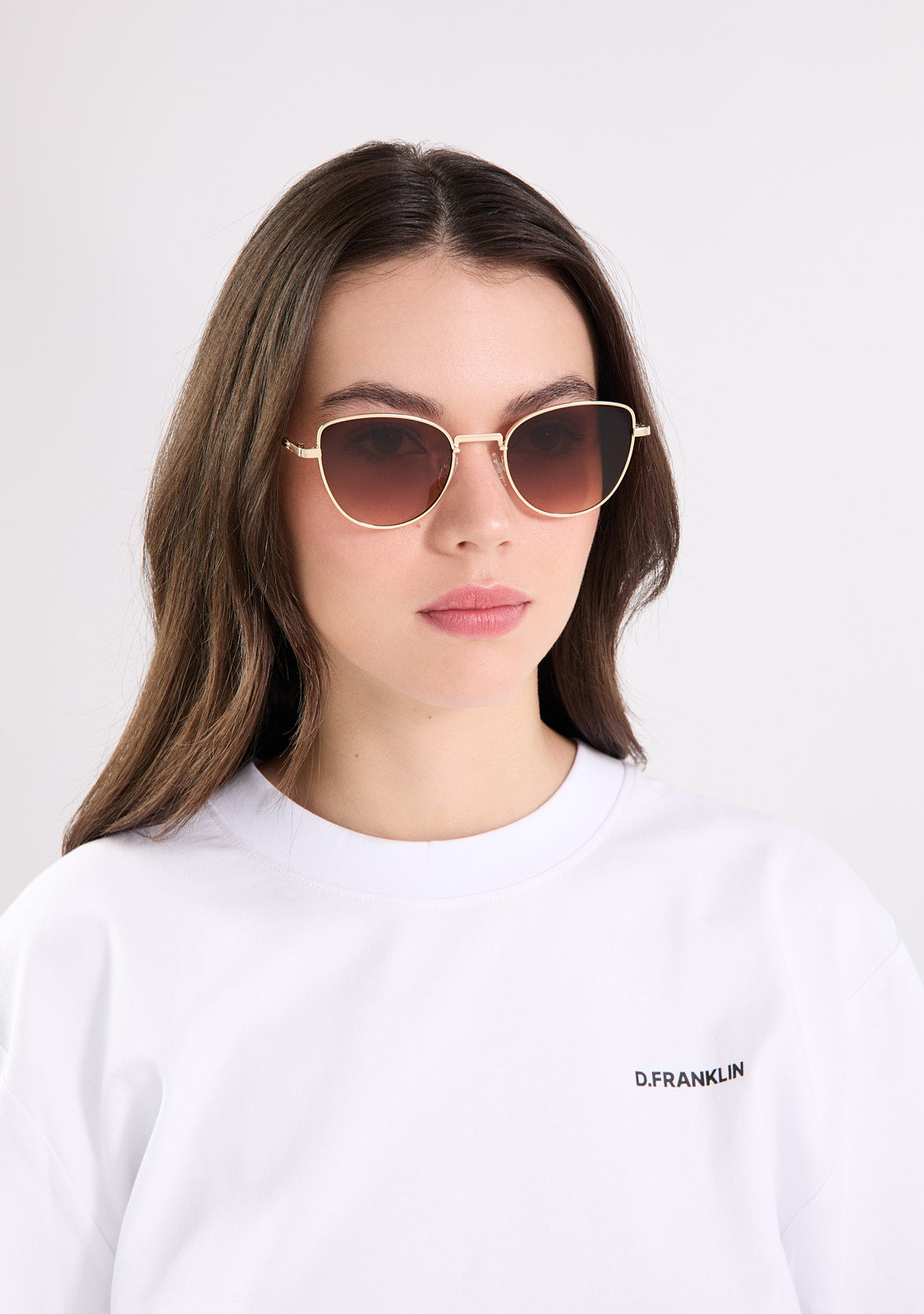 The Cat-Eye Legacy design features a metallic finish with a vintage aesthetic. Its gold-tone frame is paired with gradient brown anti-reflective lenses that allow a subtle view through and define the facial features. The front measures 139 mm, and the lens width is 53 mm. The temples are 140 mm long and incorporate our distinctive detailing. A retro yet minimalist piece to frame any outfit.