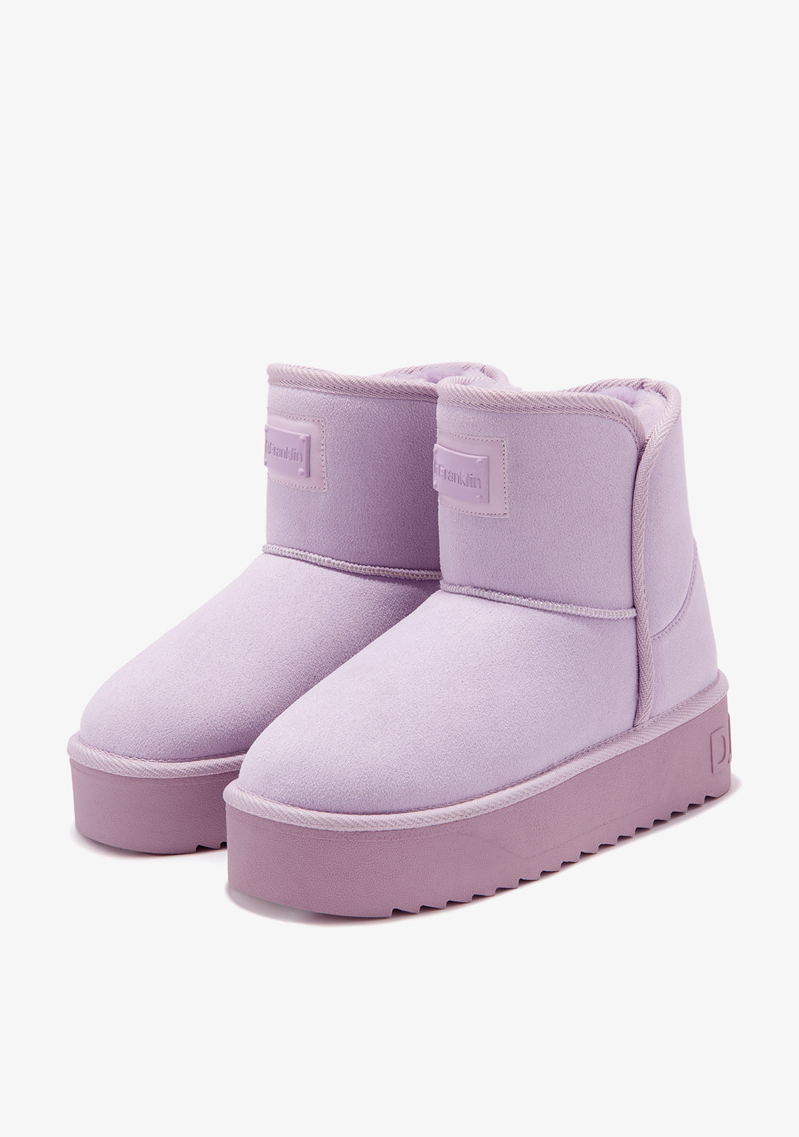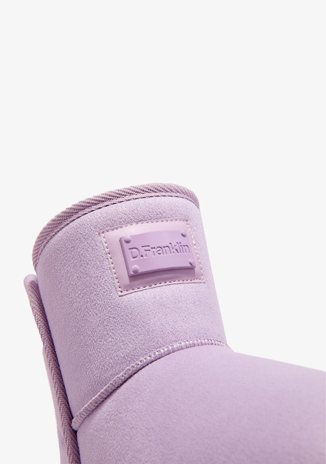 Asymmetrical cut design in lavender tone with synthetic inner lining for superior warmth.