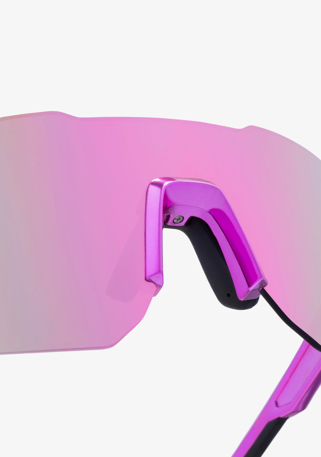 This model delves into the depths of the oceans with mirrored lenses without limits or frames. It has a fuchsia finish and features our signature emblem on the side of the temples. The uniform lens width is 145 mm and the temple width is 130 mm.