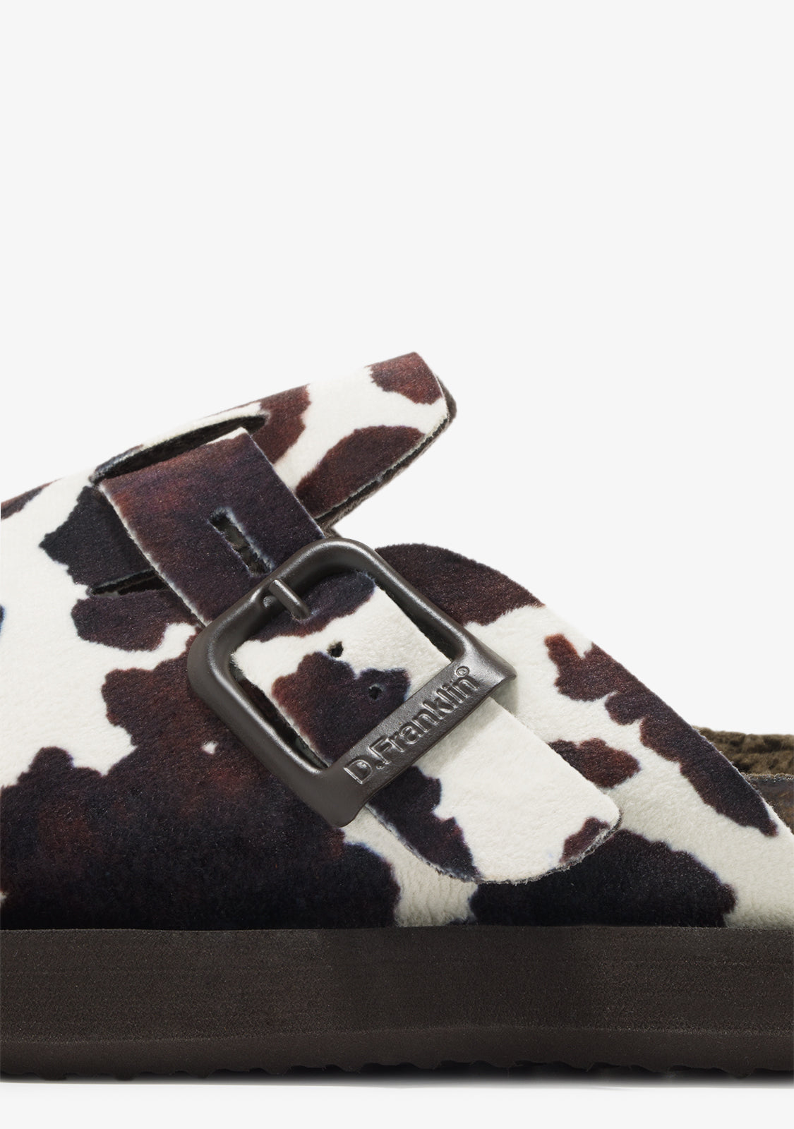 The Vibe Clog Cow by D.Franklin features a unique design with a cow print in black and white, perfect for those who want footwear with personality and originality. Made in Spain, these clogs stand out for their quality and comfort.