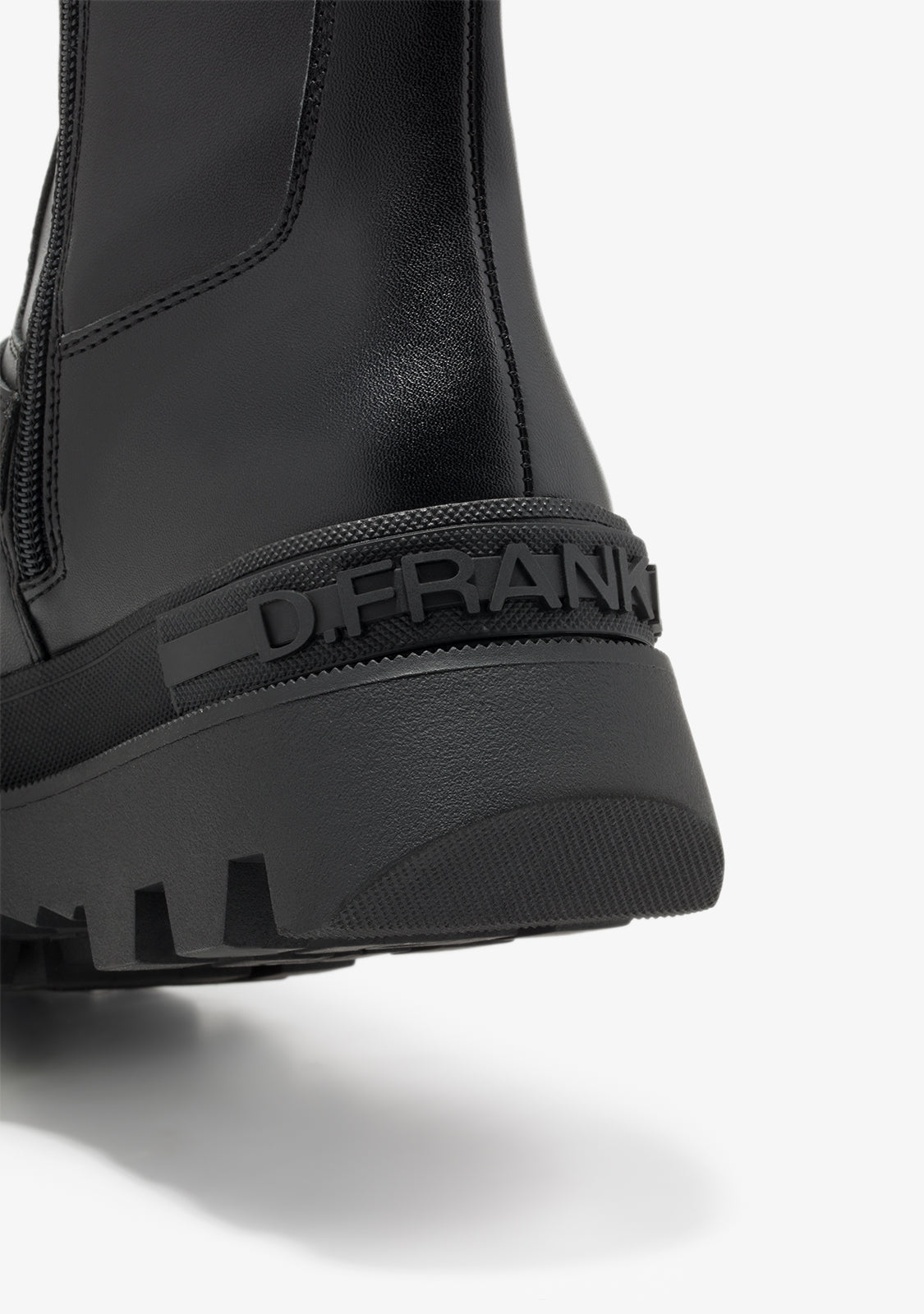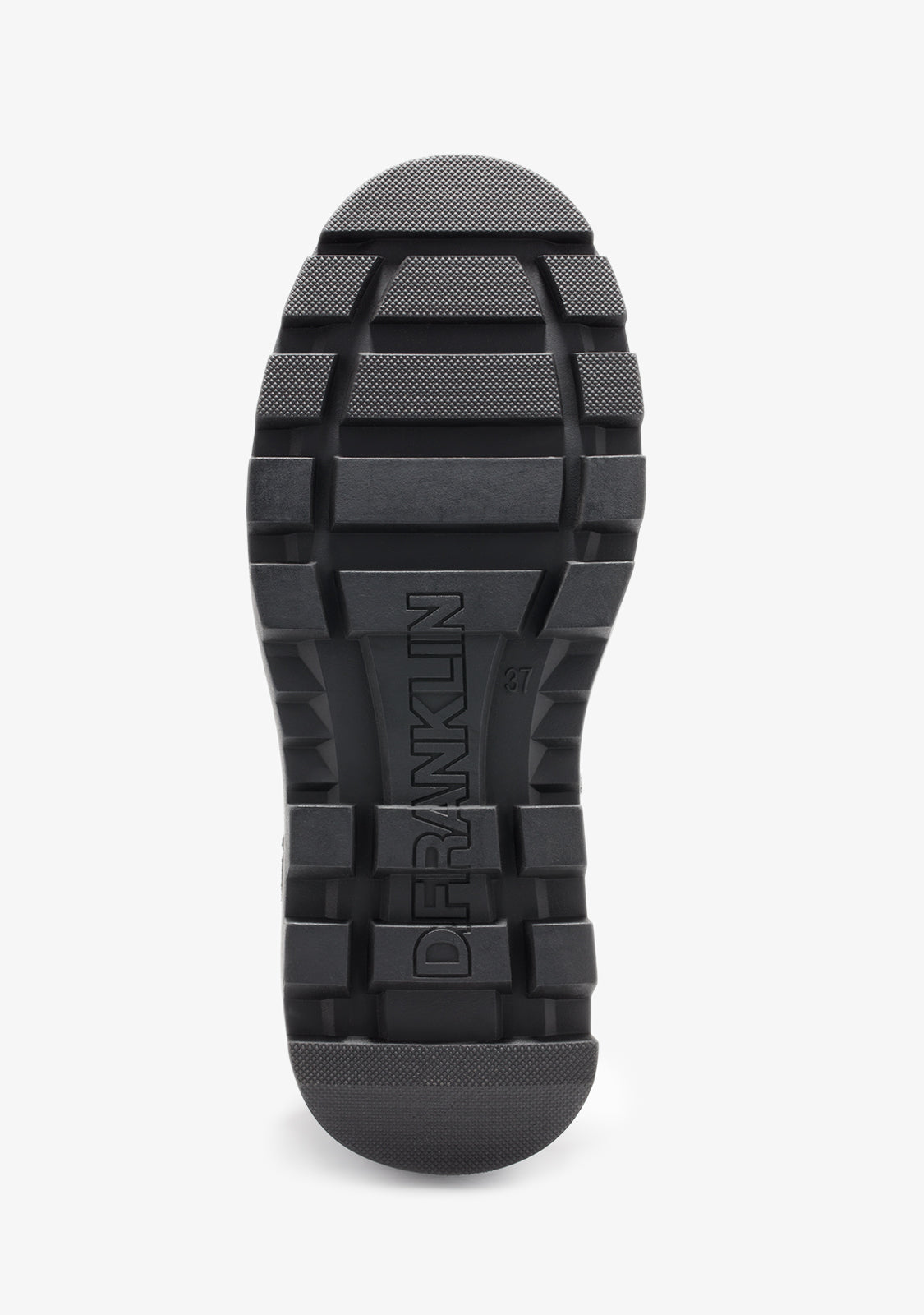 Ovaj D.Franklin model u crnoj boji ima unutarnji patentni zatvarač s jedne strane za savršeno pristajanje. Njegova potplat u stilu staze pruža neusporedivu prianjivost. Sadrži naš logo i grb utisnute na peti i prstima. Osim toga, ima ikonične detalje s kopčama na donjem i gornjem dijelu, što dodatno doprinosi njegovoj karakterističnoj estetici.