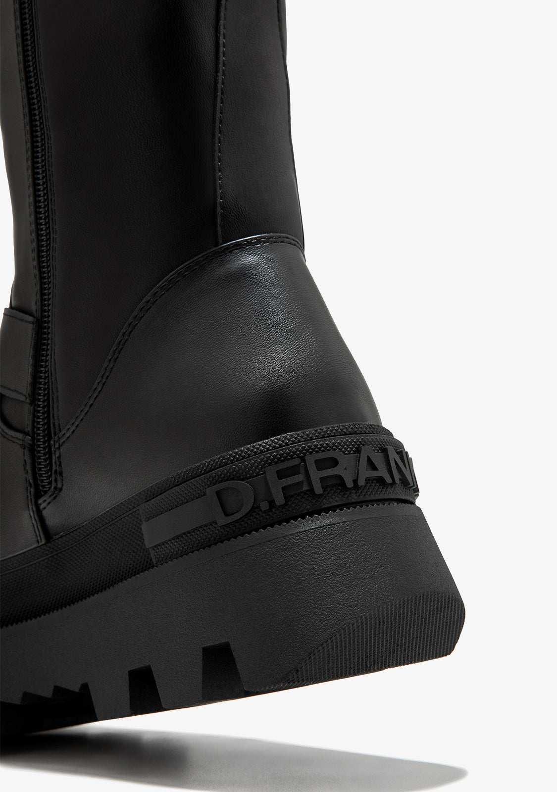 Ovaj D.Franklin model u crnoj boji ima unutarnji patentni zatvarač s jedne strane za savršeno pristajanje. Njegova potplat u stilu terena pruža neusporedivu prionjivost. Sadrži naš logo i grb utisnute na peti i prstima. Dodatno, ima ikonične detalje s kopčama na donjem i gornjem dijelu, što doprinosi njegovoj karakterističnoj estetici.
