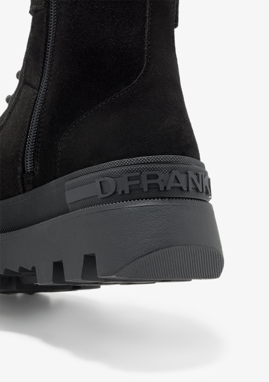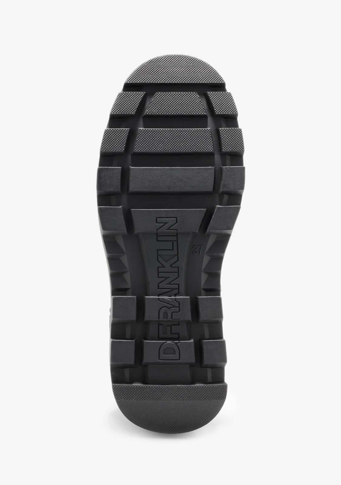 Ovaj D.Franklin model u crnoj boji ima unutarnji bočni patentni zatvarač i podesive pamučne vezice. Njegov potplat s profilom pruža izvrsno prianjanje i izdržljivost, dok su logo i amblem suptilno utisnuti na peti i vrhu čizme.