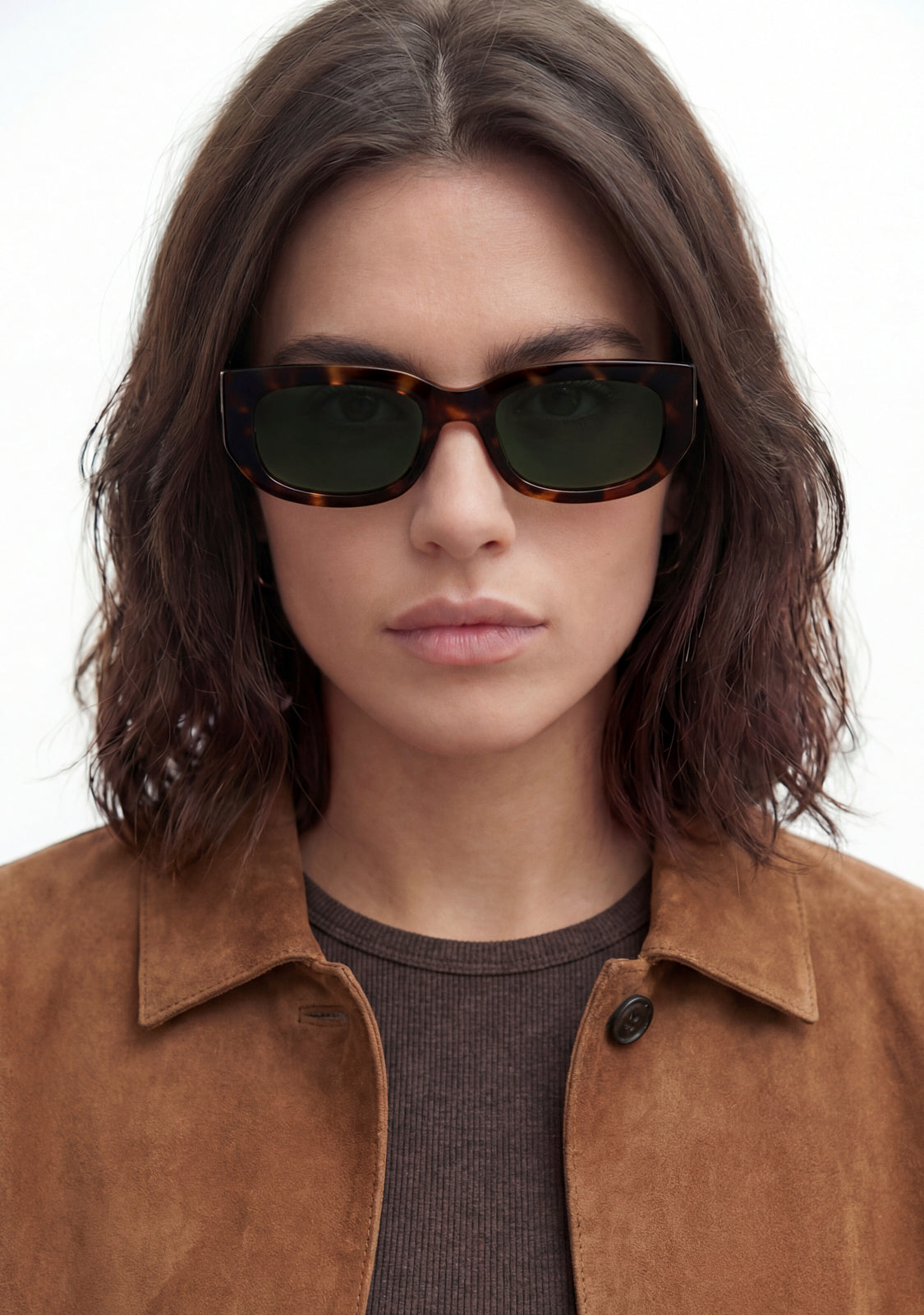 Naočale Blaze Tort / G15 imaju hrabar pravokutni oblik s elegantnim školjkastim okvirom i zelenim lećama. Inspirirane retro oblicima i pročišćene čistim linijama, dodaju samouvjereno osvježenje svakodnevnim izgledima.