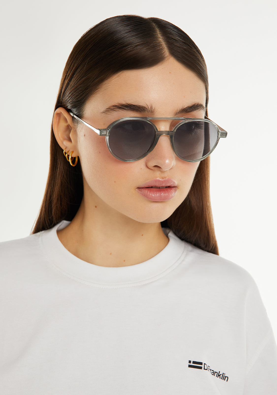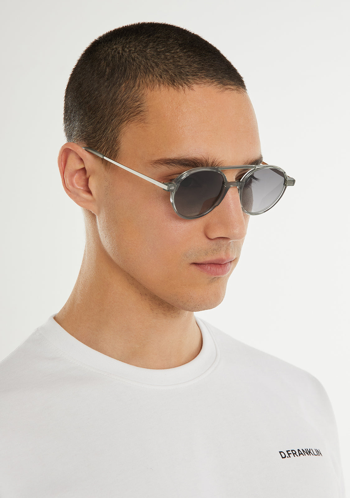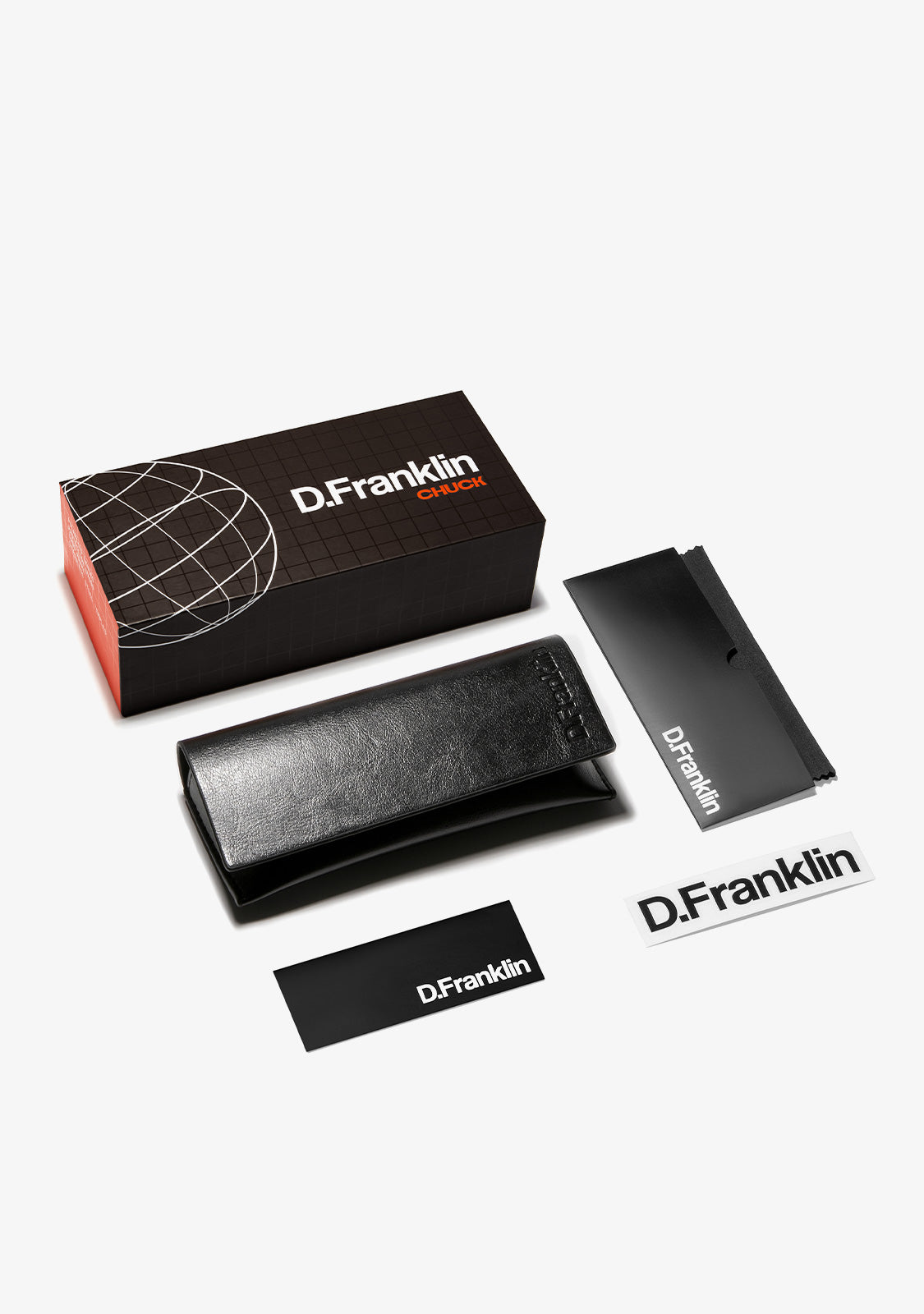 Naše sivo-tonirane Chuck naočale sadrže prepoznatljive D.Franklin detalje, ugravirani logo na sljepoočnicama i emblem na leći. Širina leće je 50 mm, a prednja strana je 140 mm. Dužina bočnih sljepoočnica je 145 mm, što je prikladno za sve oblike lica.