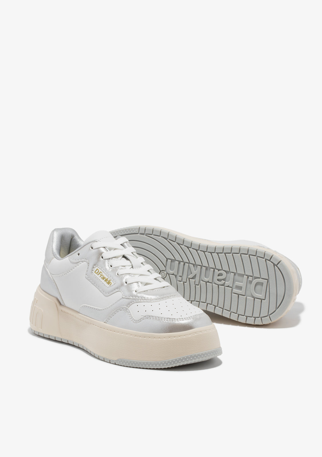 Bijele Court D.Franklin tenisice izrađene su s srebrnim detaljima i pamučnim vezicama. Kontrastna potplat ima urezani logo na peti i potplatu. Imaju visinu od 4 cm i phylon potplat za lagano ublažavanje.
