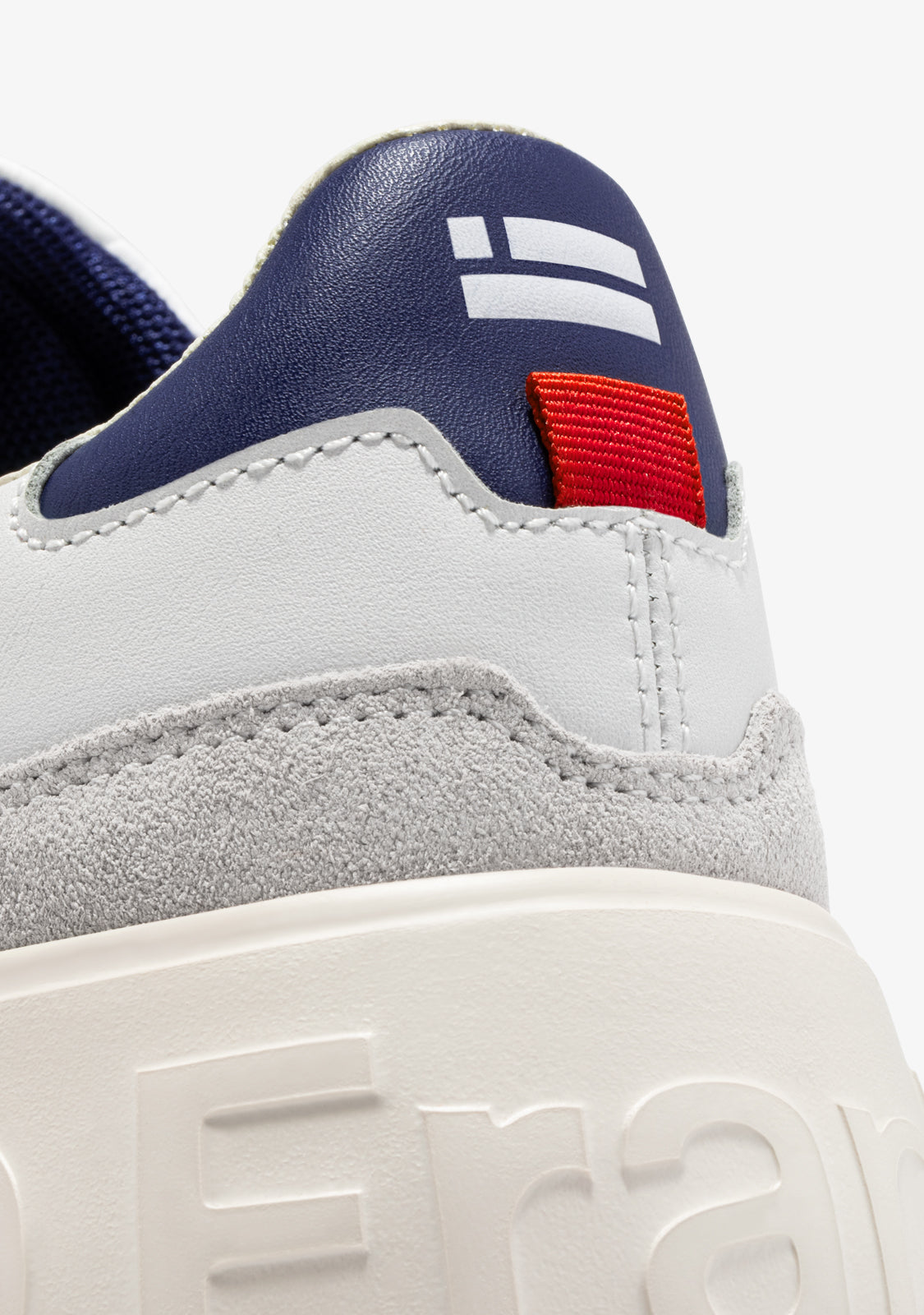 Naš Court model je izrađen s mornarsko plavim detaljima. Ima kontrastnu sivu potplat s utisnutim logotipom na peti i potplatu. Osim toga, također ima plavu zastavu sa strane. S visinom od 4 cm i phylon potplatom za lagano ublažavanje. Njegova unutarnja uložak je anatomski i uklonjiv.