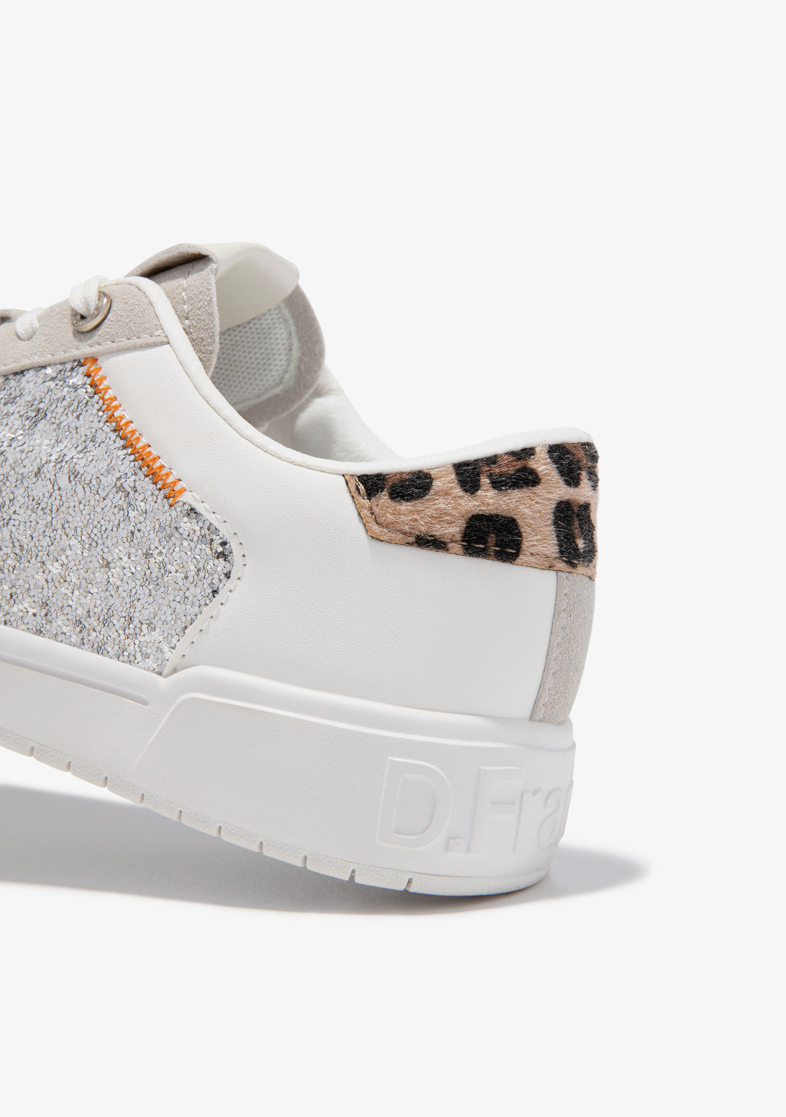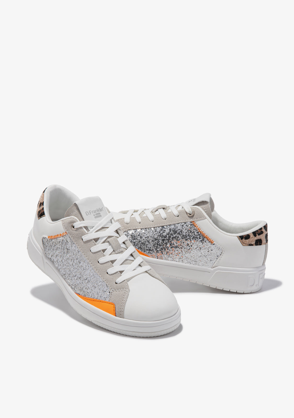 Model Court V2 Tennis Basic Glitter Silver Leo D.Franklin izrađen je s bijelim, narančastim i sjajnim srebrnim detaljima, kao i leopard uzorkom. Imaju potplat s utisnutim logotipom na peti, potplatu i strani. S redizajniranim potplatom visine 2 cm i phylon potplatom za lagano ublažavanje. Anatomsku uložak također je moguće ukloniti.