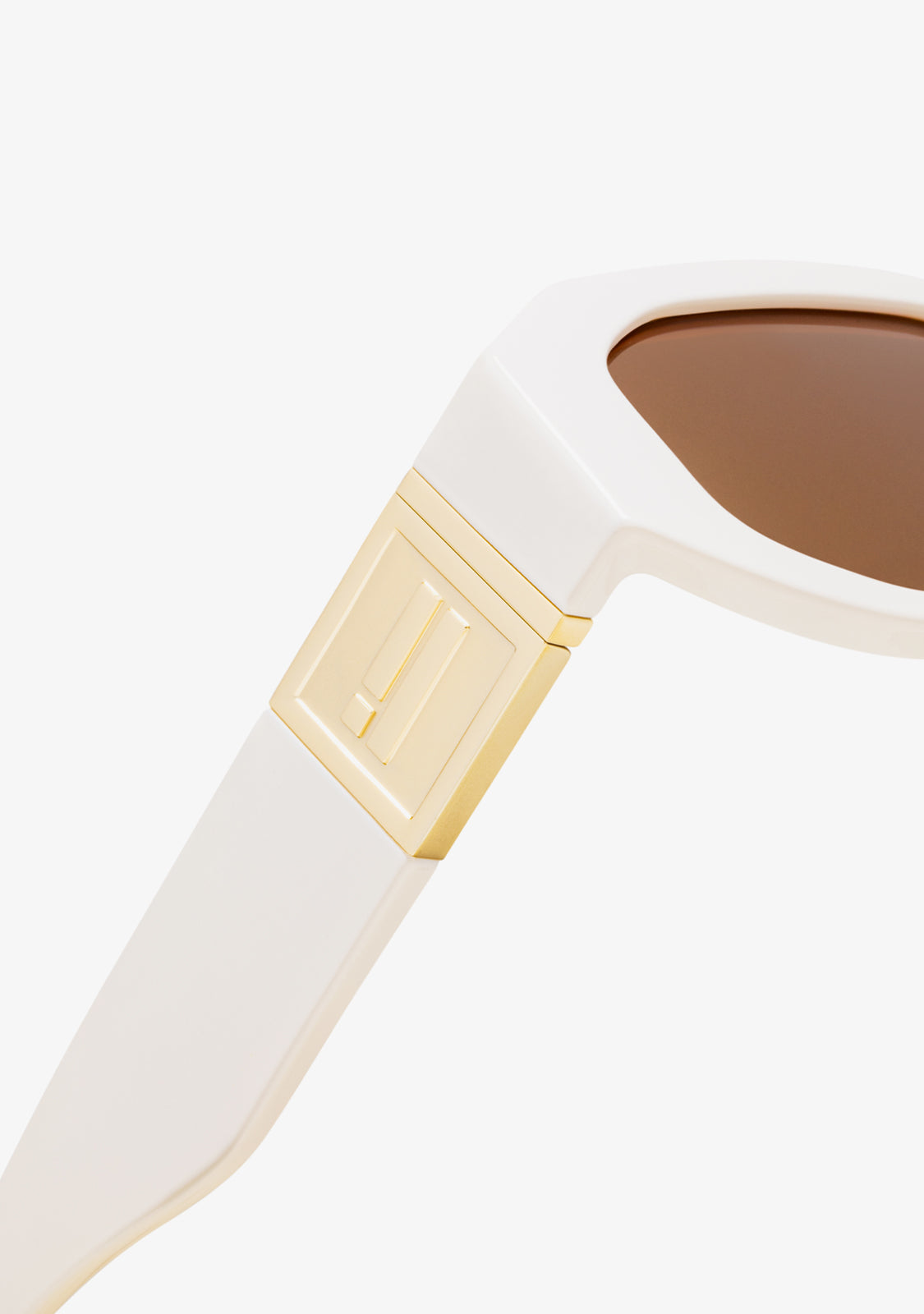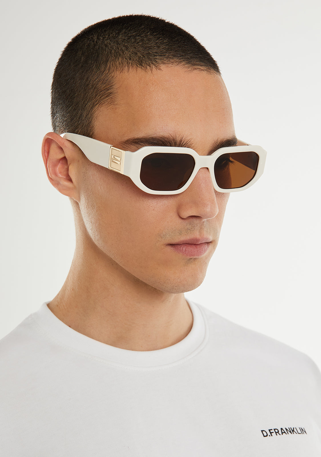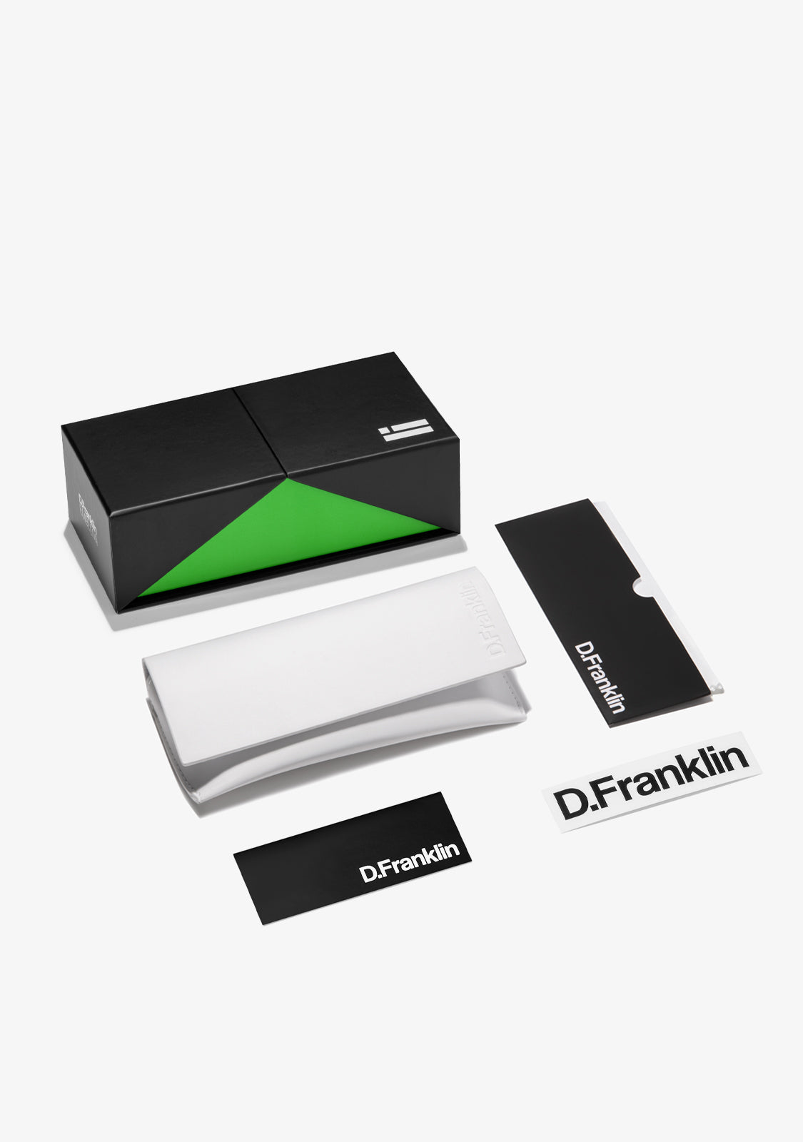 Smeđi polarizirani leće i bijele okvire ističu jedinstvenost ovog dizajna. Sadrži našu prepoznatljivu D.Franklin zastavu s metalik zlatnim završetkom na oba sljepoočnica. Širina leće od 52 mm i prednji okvir od 139 mm spojeni su asimetričnom sljepoočnicom od 140 mm.