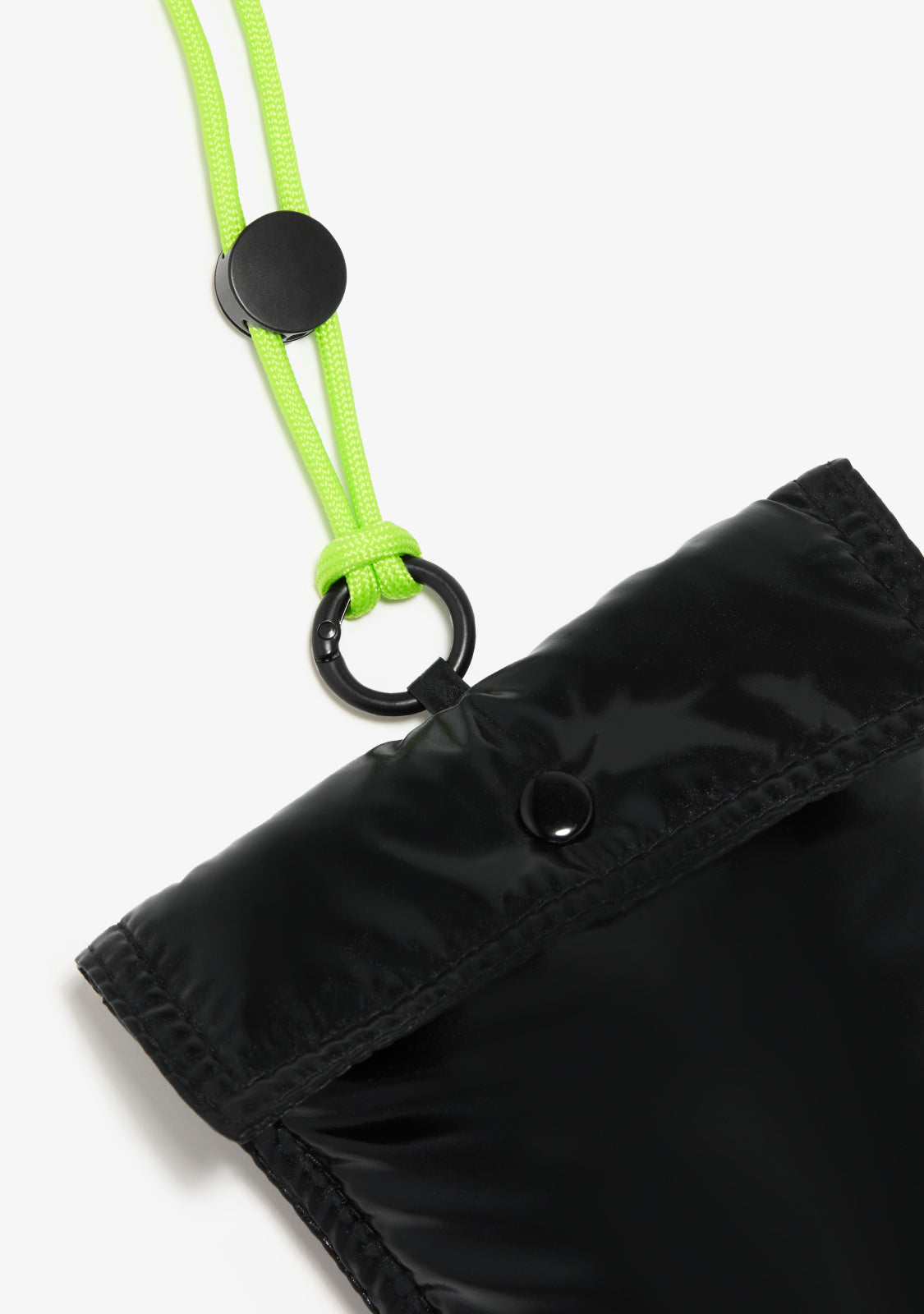 Ovaj model s iridescentnom crnom završnom obradom ima uklonjivu žicu u boji limete zahvaljujući svom metalnom prstenu koji omogućuje prilagodbu duljine. Ima kopču na gumb i D.Franklin logo u boji limete otisnut na prednjoj strani.