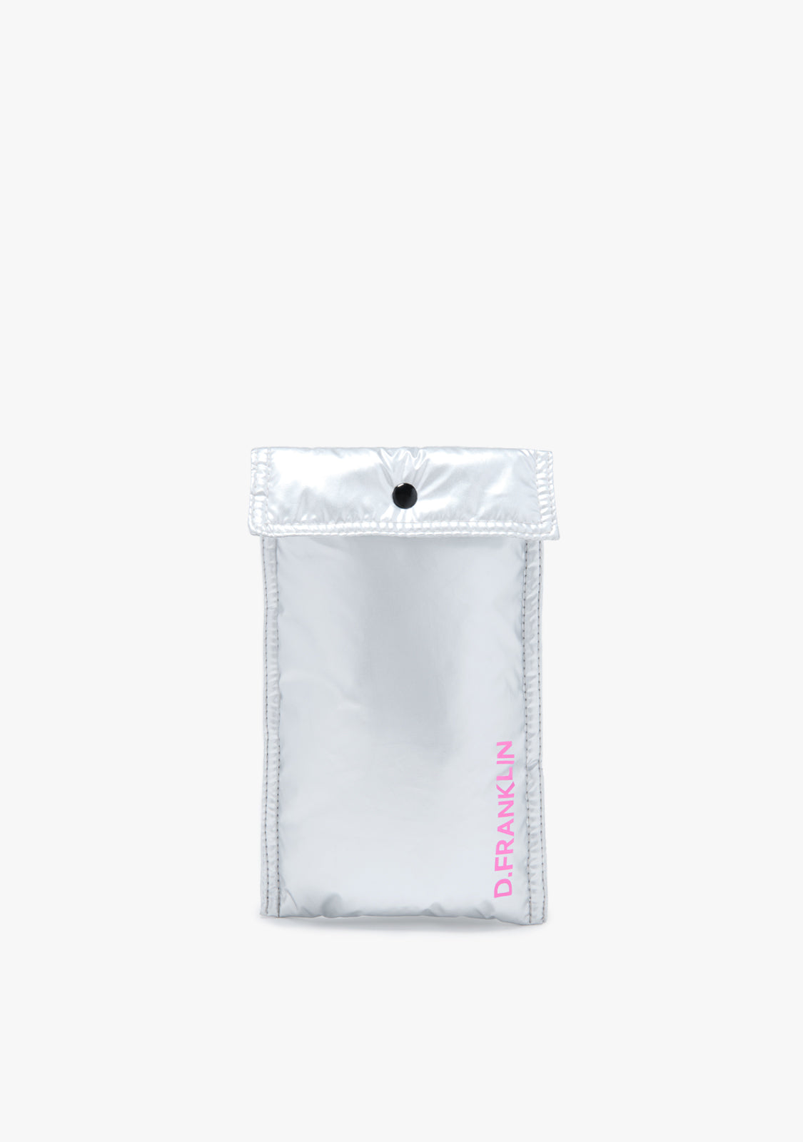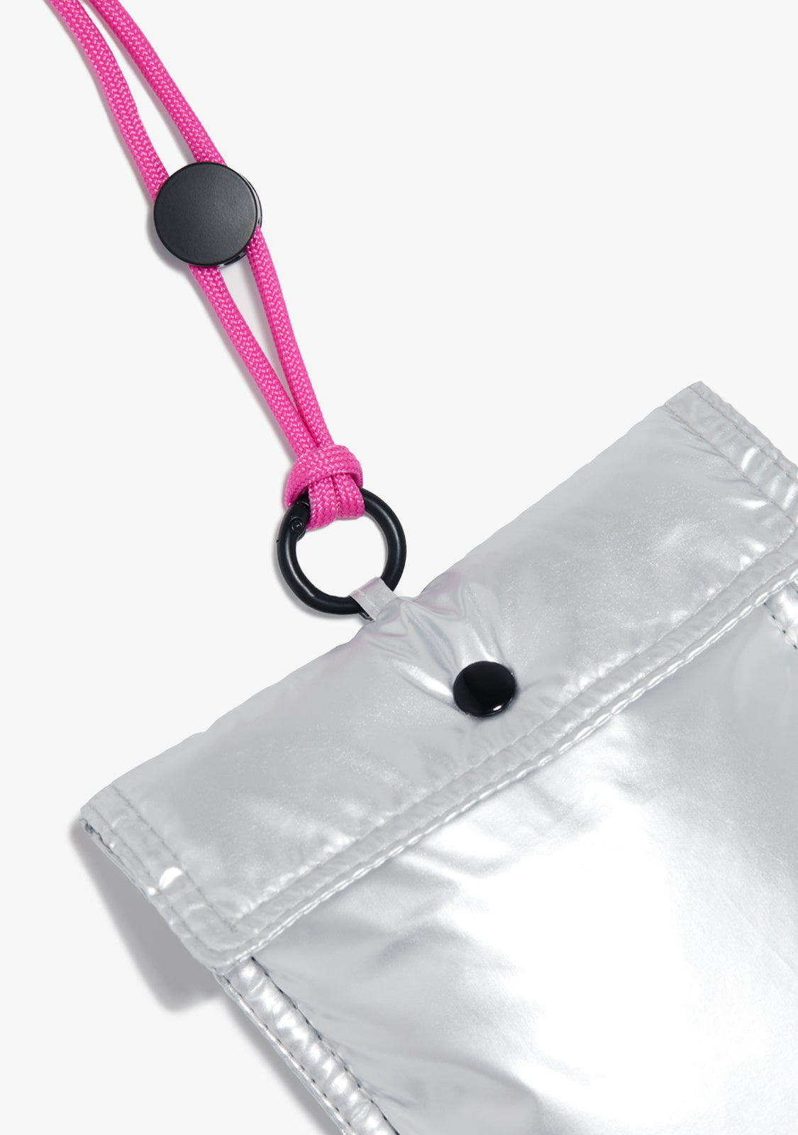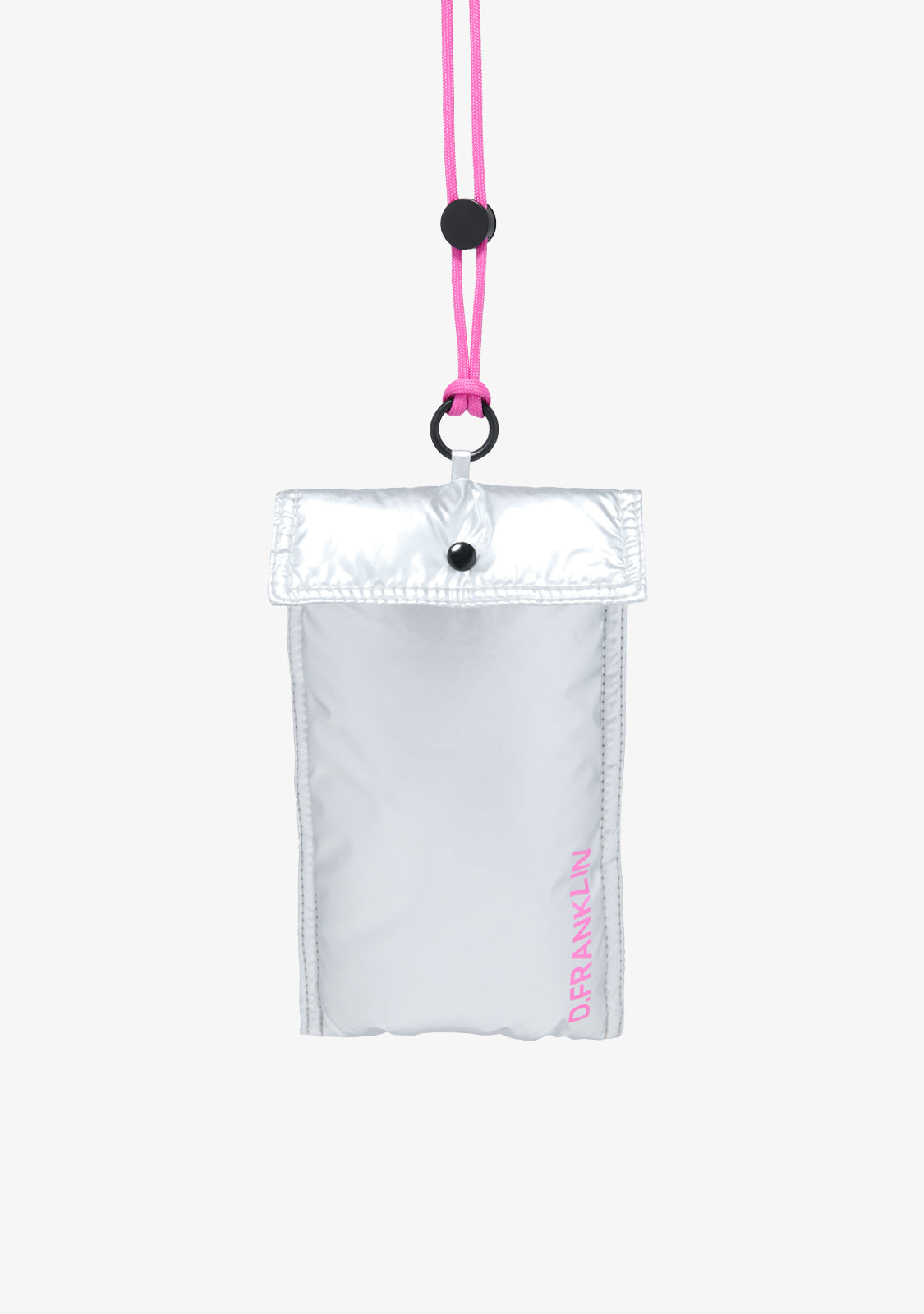 Ovaj model s iridescentnim srebrnim završetkom ima uklonjivu fuksija vrpcu zahvaljujući svom metalnom prstenu koji vam omogućuje da prilagodite njegovu duljinu. Ima kopču na gumb i fuksija ekranom otisnuti D.Franklin logo sprijeda.