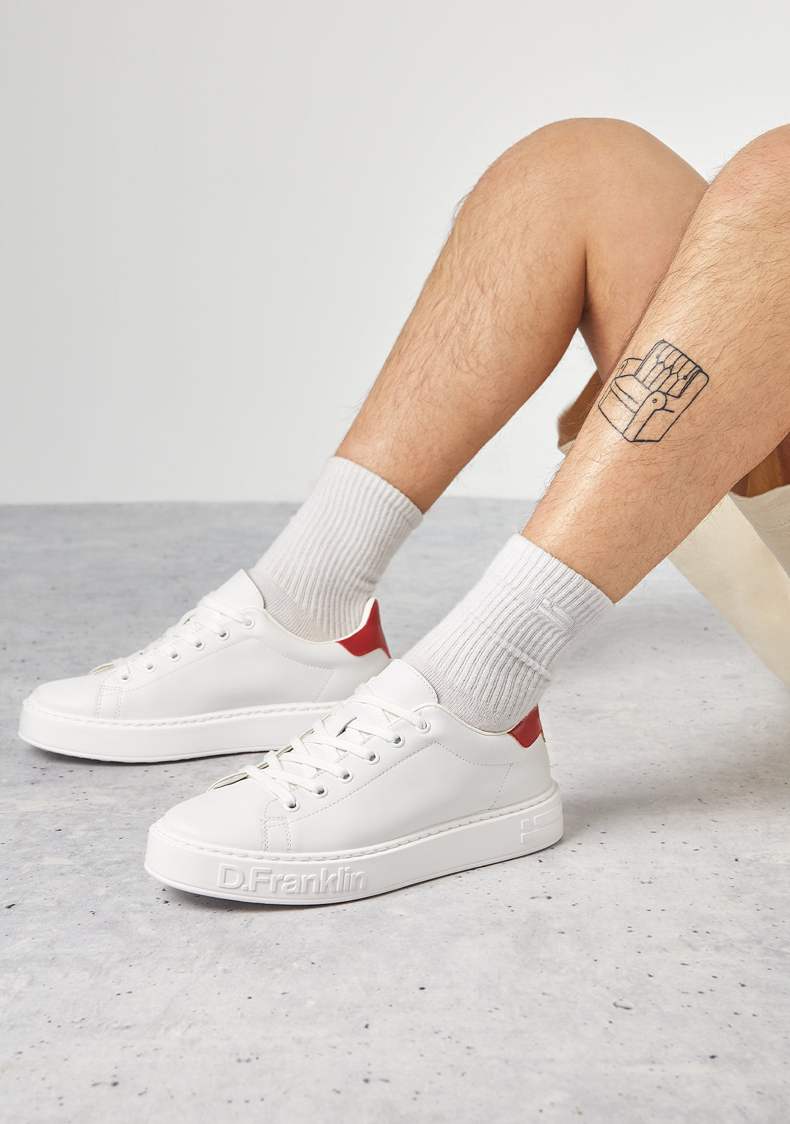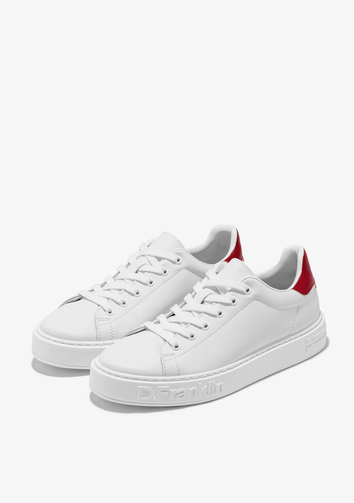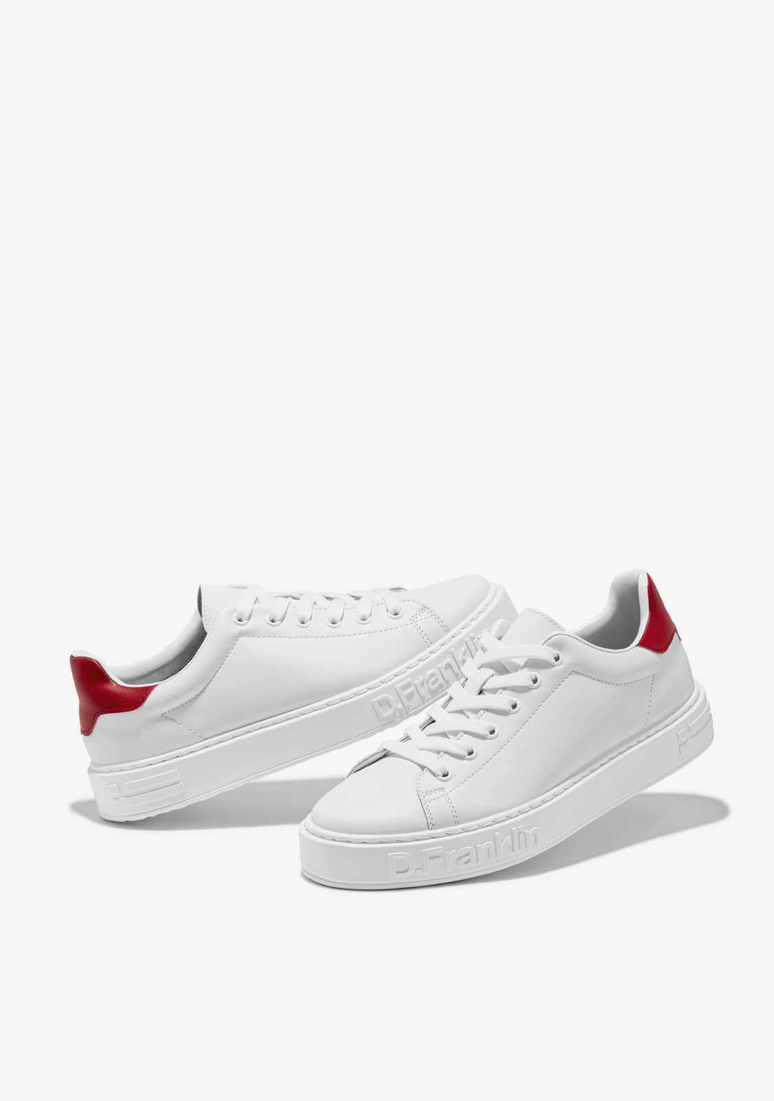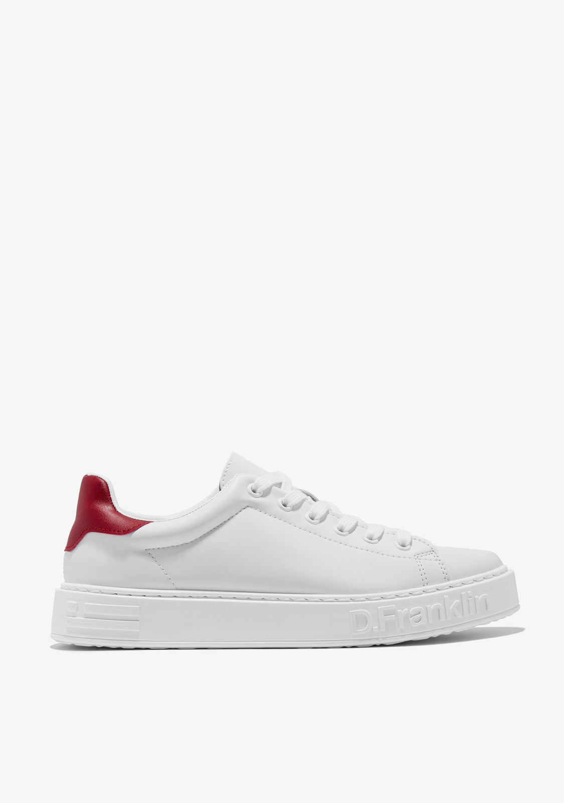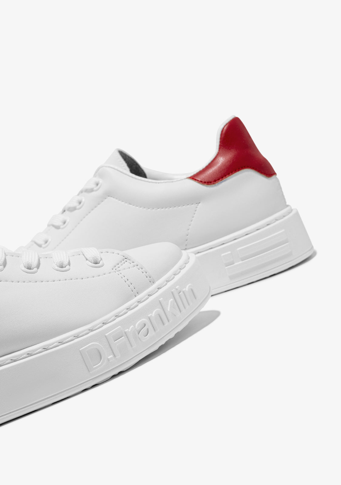 Cipele D.Franklin Gumme 101 upijaju energiju velikih kapitala s jednostavnim dizajnom od bijele umjetne kože i crvenim detaljima. Imaju potplat visine 3,5 cm za lagano ublažavanje pri svakom koraku. S podesivim pamučnim vezicama za savršeno pristajanje.