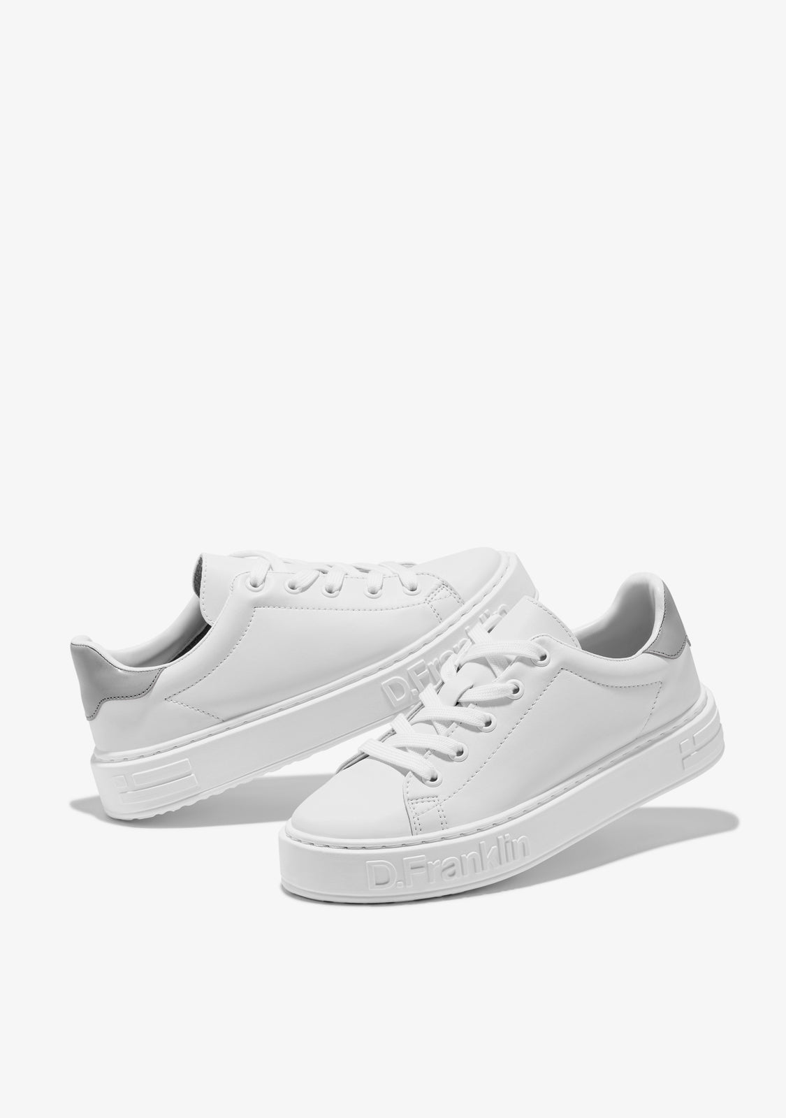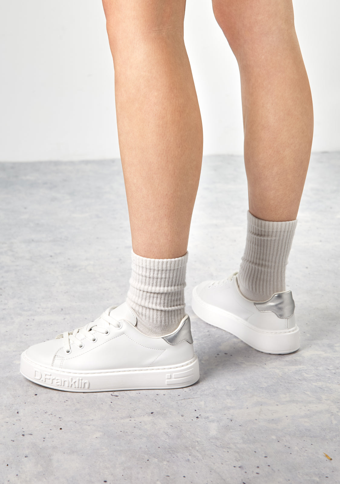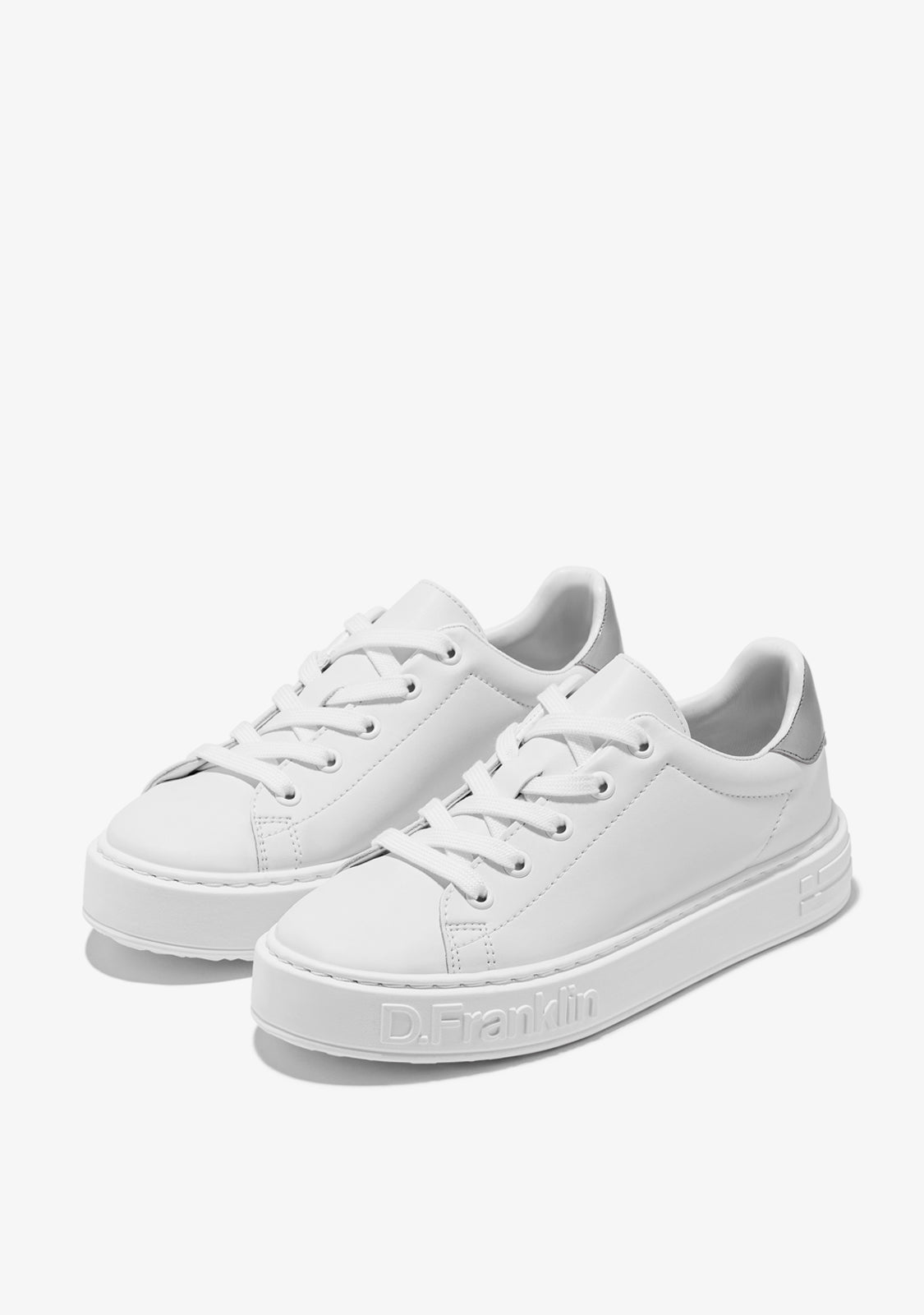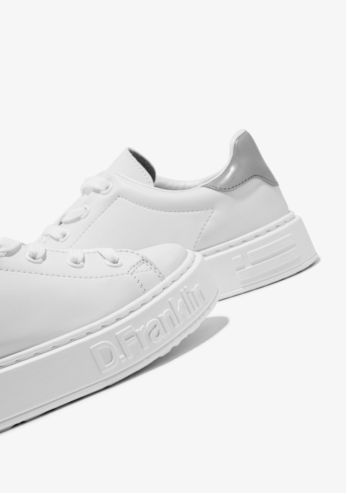 Cipele D.Franklin Gumme 101 upijaju energiju velikih kapitala s jednostavnim dizajnom u bijeloj umjetnoj koži i srebrnim detaljima. Imaju potplat visine 3,5 cm za lagano ublažavanje s svakim korakom. S podesivim pamučnim vezicama za savršeno pristajanje.