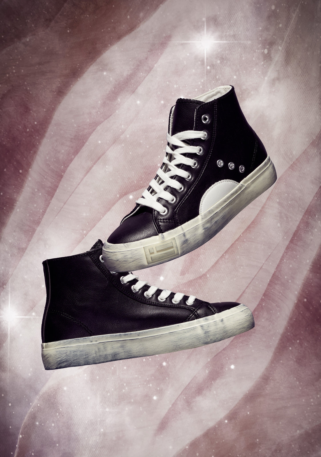 Ovaj model izrađen je od umjetne kože i mikrovlakana u crnim i bijelim tonovima. Ima pamučne vezice i odgovarajući bijeli polukrug s tri metalna detalja. Bijela monokromatska gumena potplat visine 4 cm s D.Franklin emblemom sa strane i natpisom na peti.