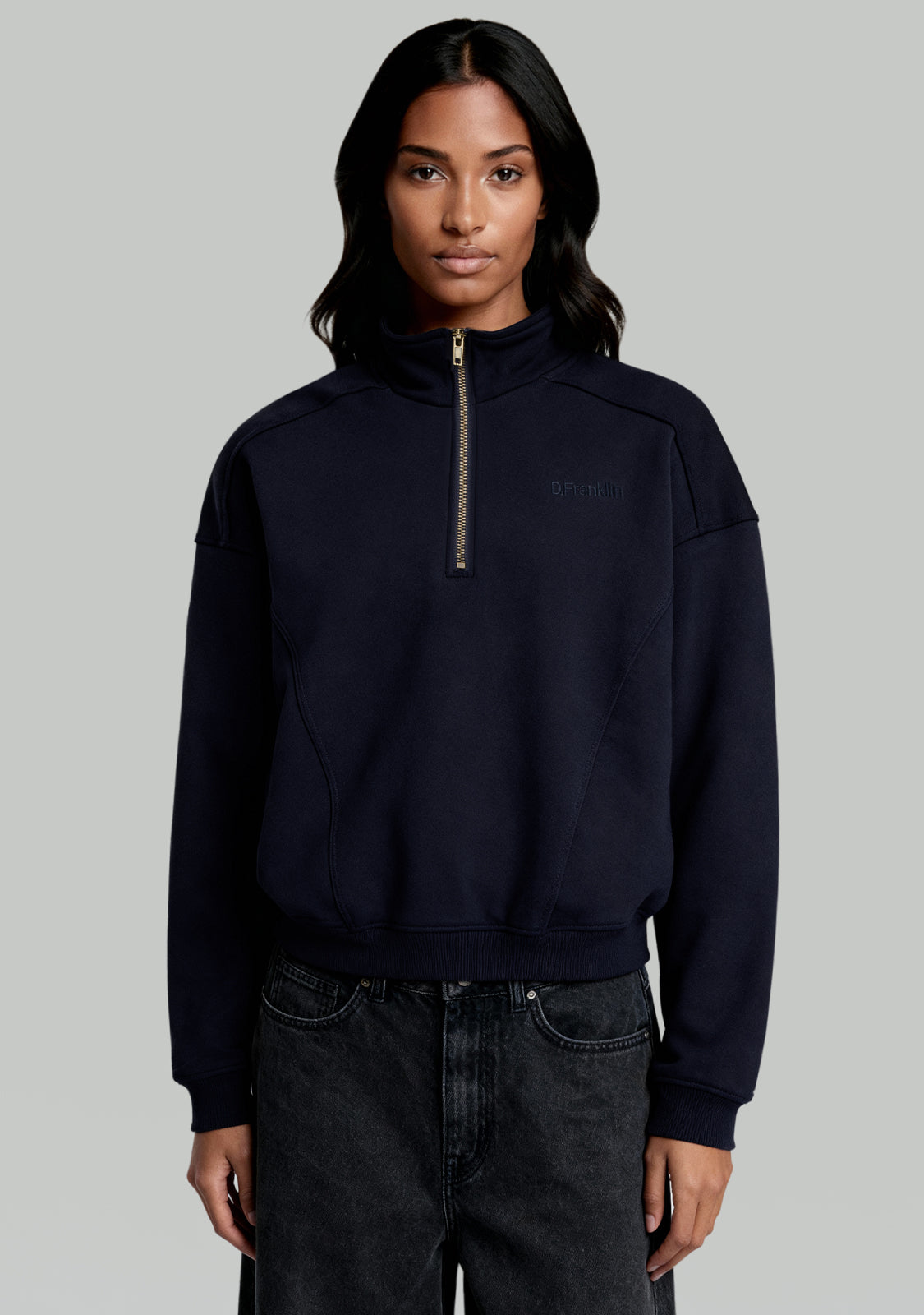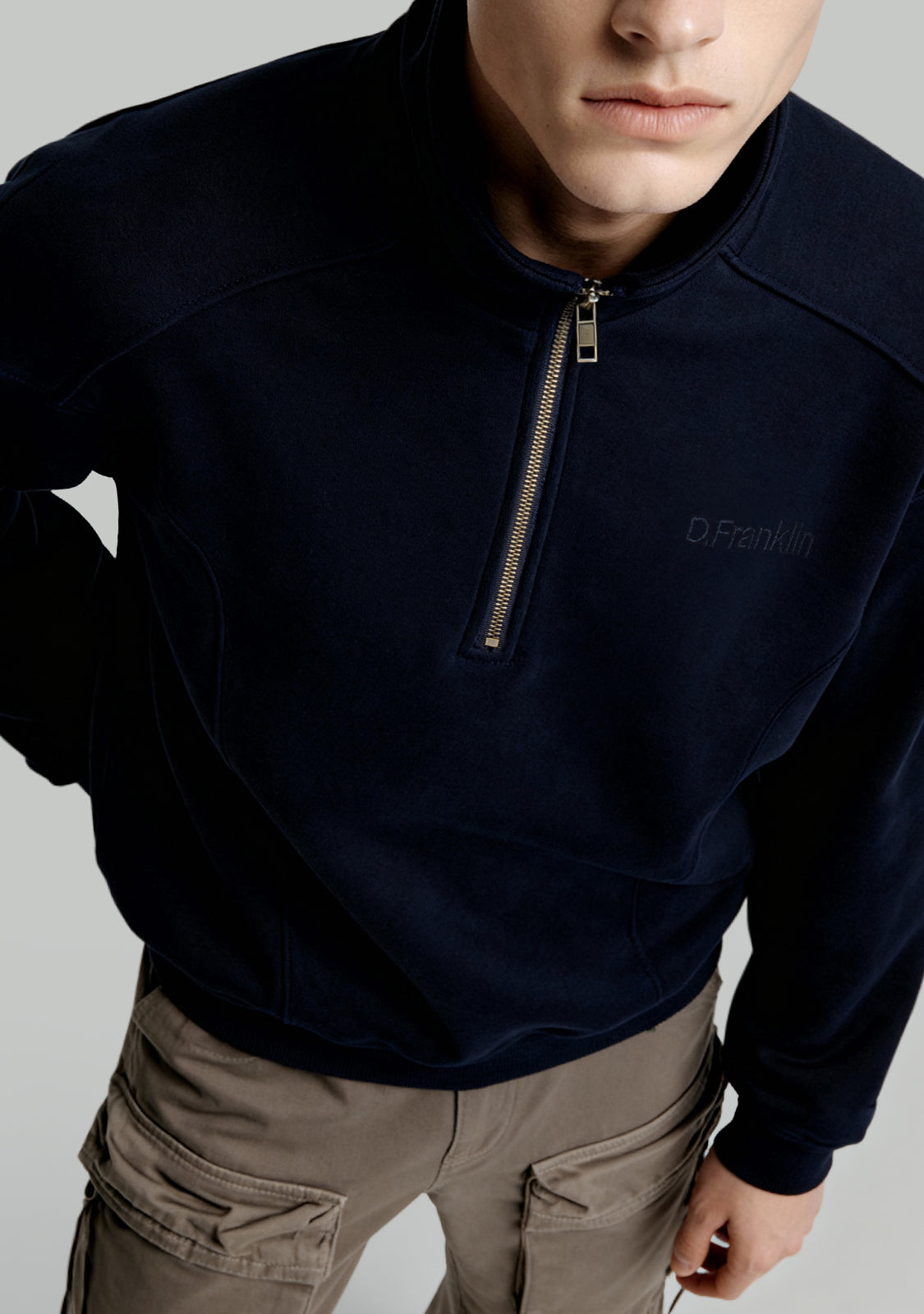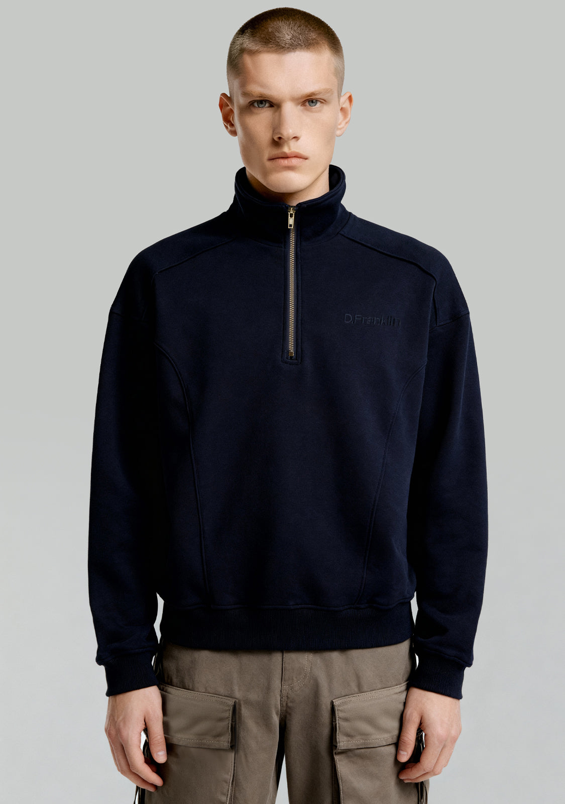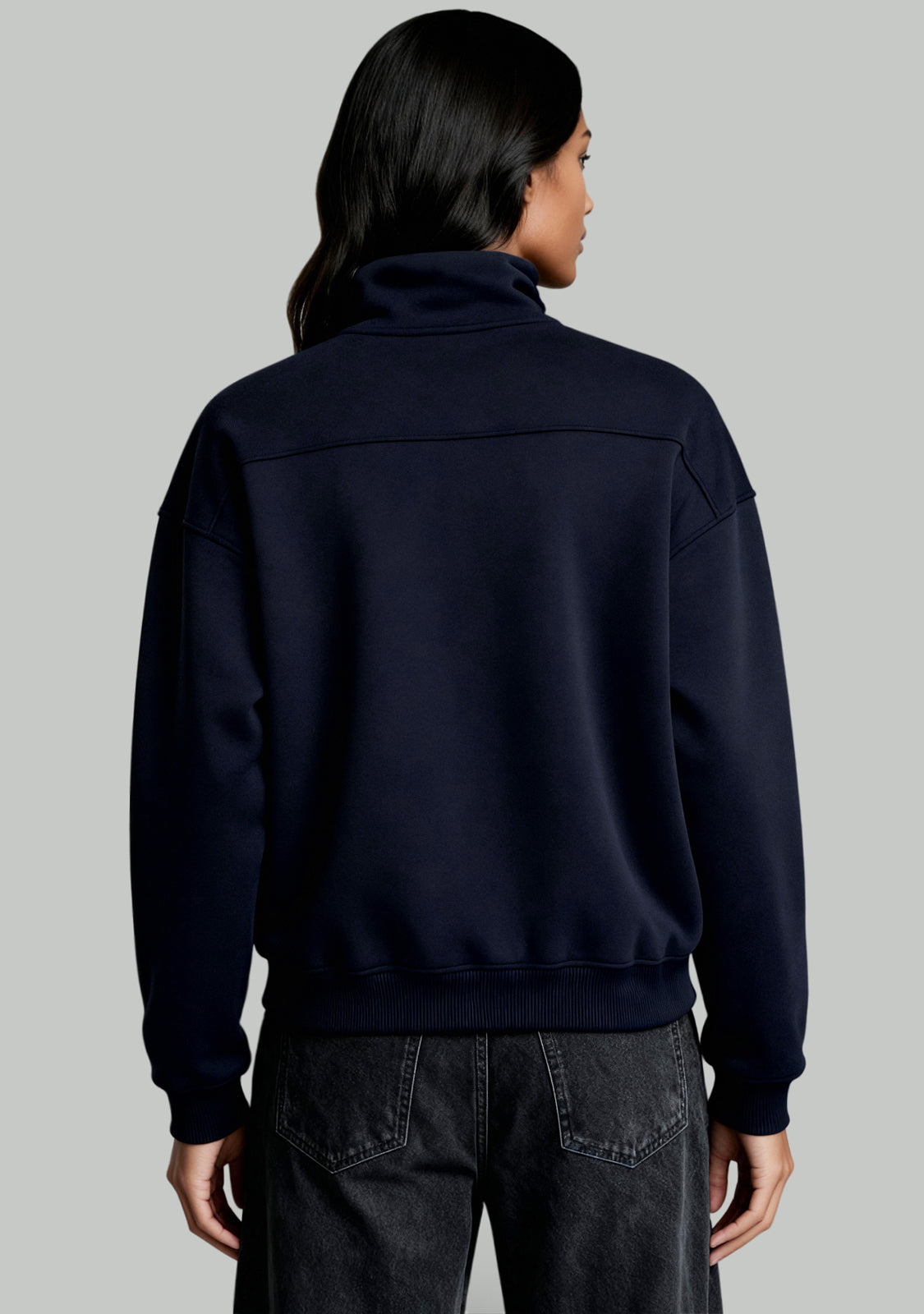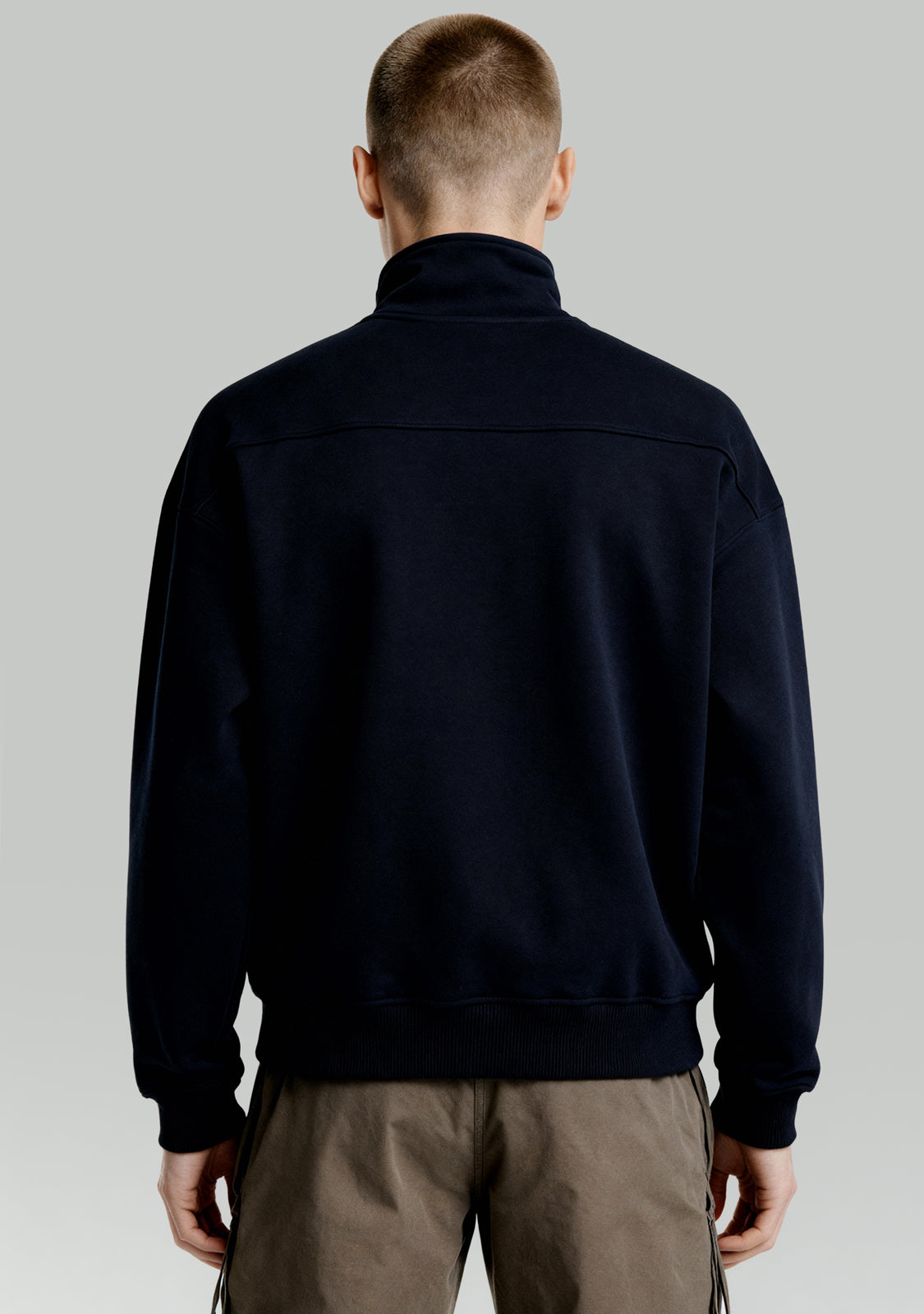 Half-Zip Sweatshirt Navy je unisex sweatshirt koji spaja udobnost i modernu strukturu. Ovratnik s patentnim zatvaračem pruža fleksibilnost, dok naglašeni šavovi razbijaju jednostavnost i stvaraju dinamičan izgled.