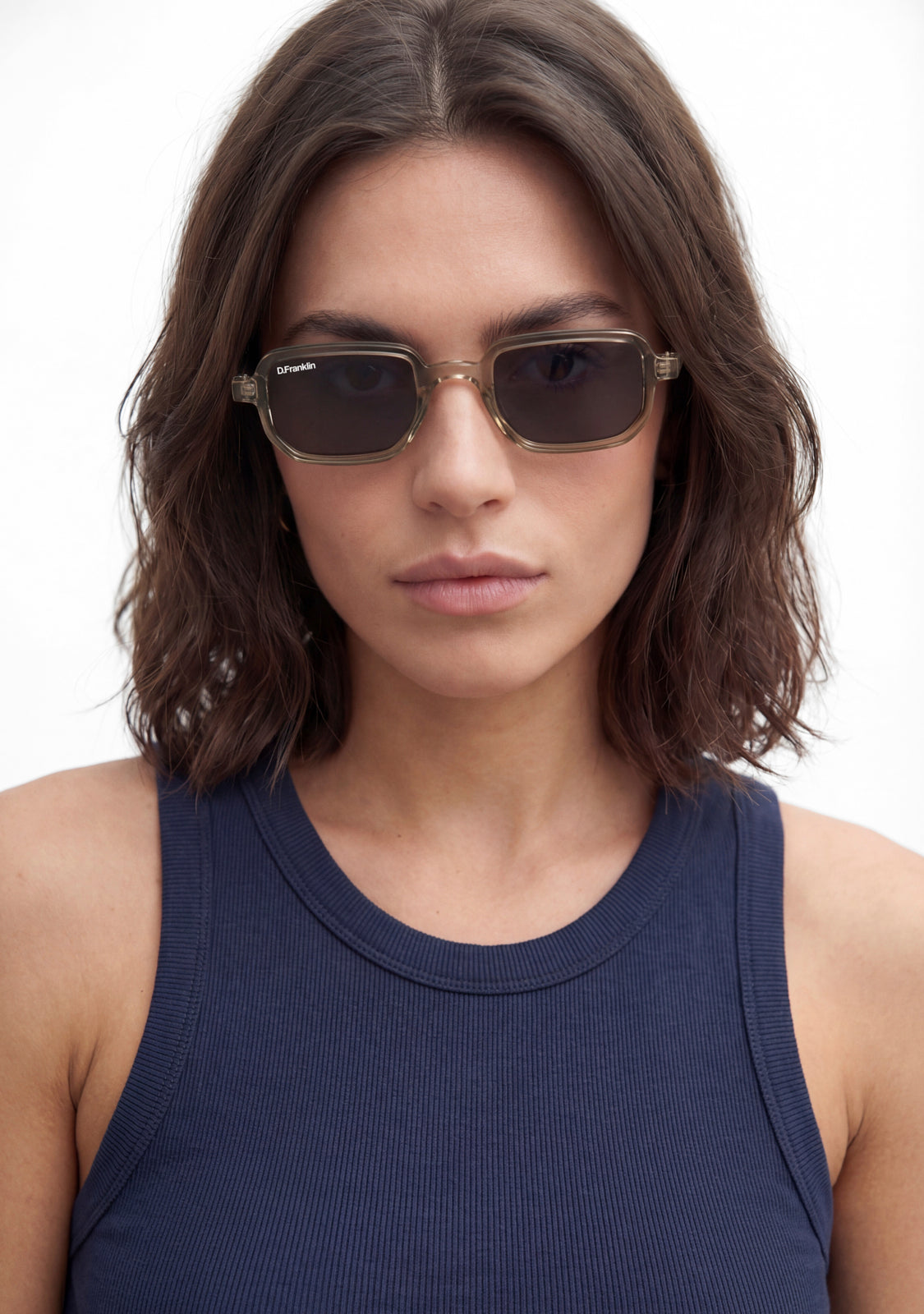 Pogledajte naš model Jiggy u taupe tonovima. Ova silueta inspirirana retro stilom sadrži prepoznatljive D.Franklin detalje: logo ugraviran na sljepoočnicama i grb na leći. Širina leće je 47 mm, a prednja strana je 143 mm. Dužina bočnih sljepoočnica je 145 mm.