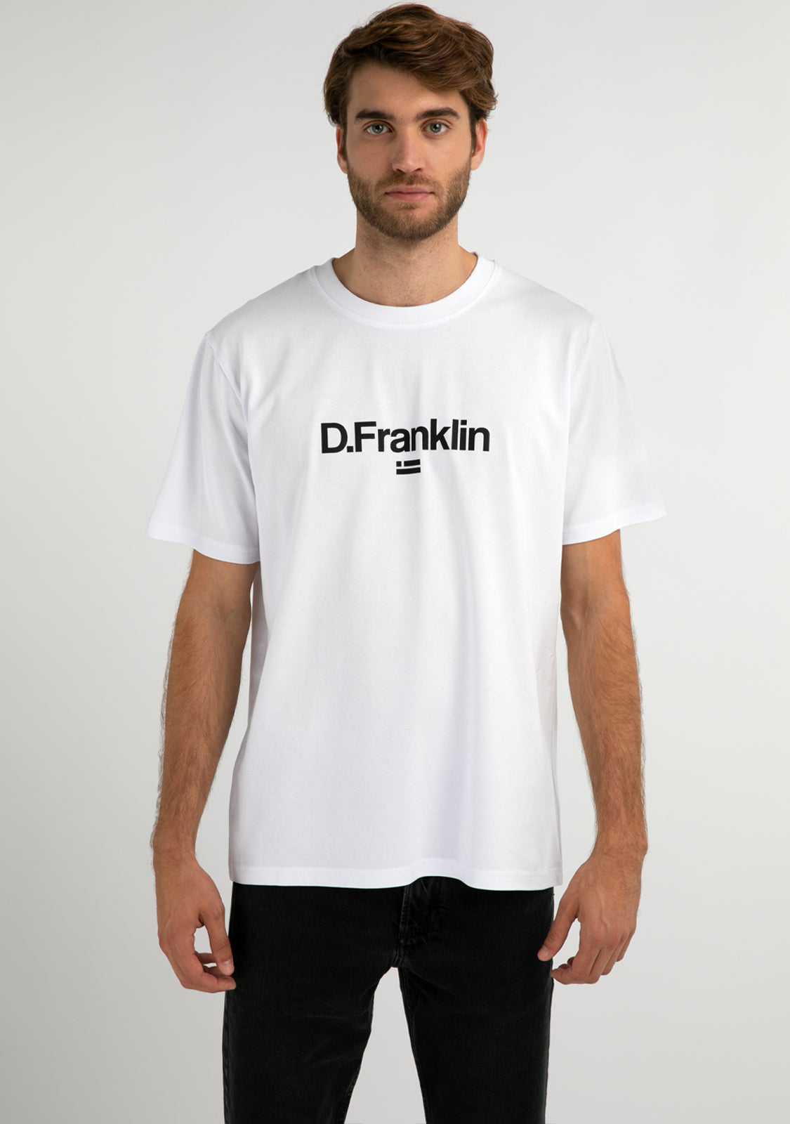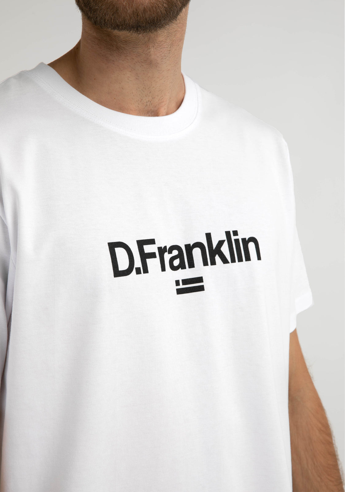 Bijela majica koja pojednostavljuje ikonografiju D.Franklin s logotipom i grbom naše marke na prsima u crnoj boji. Okrugli izrez s dvostrukim šavom. Izrađena od 100% organskog pamuka.