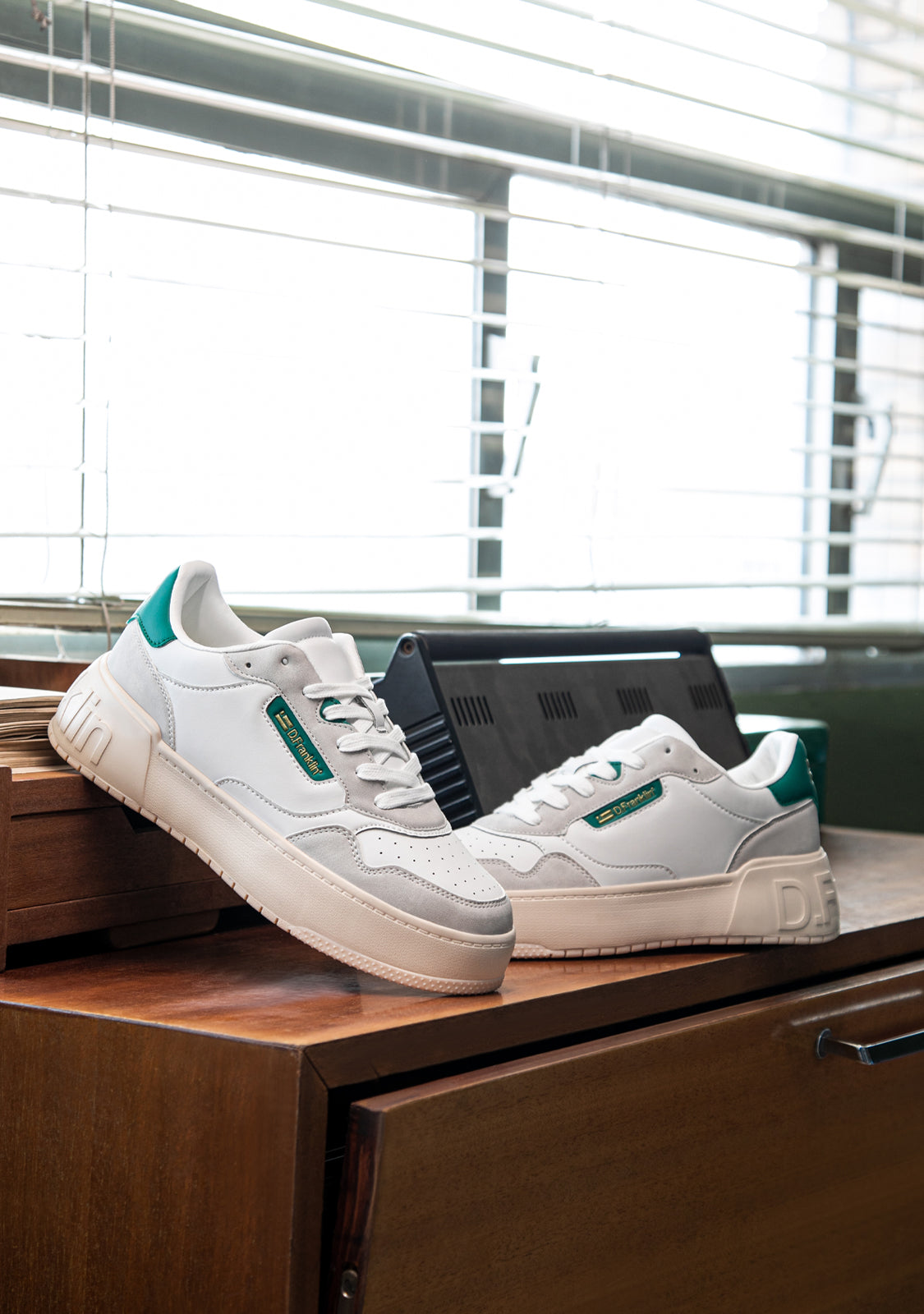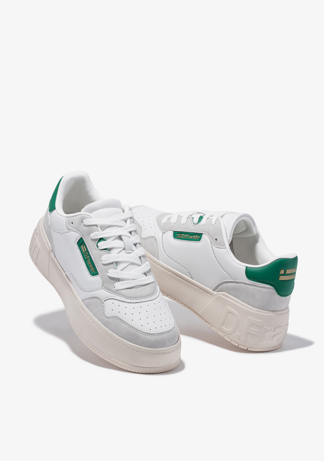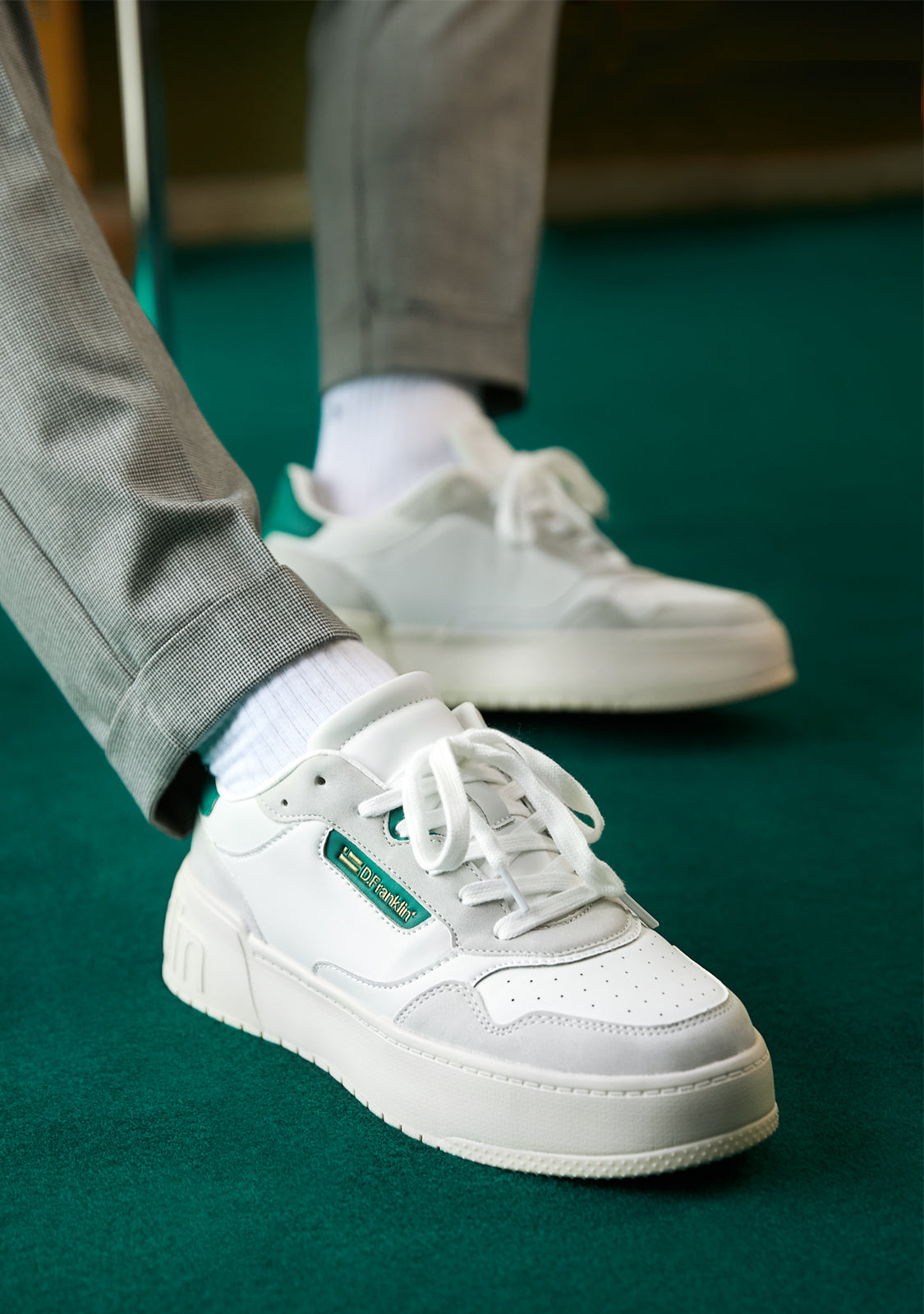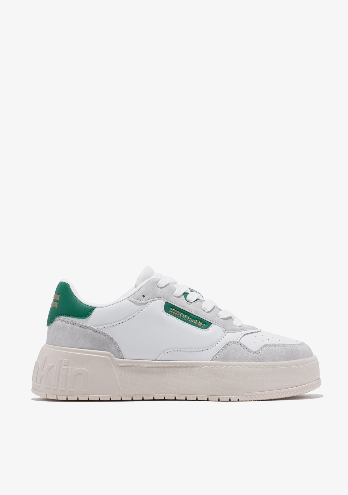 Profinjen pristup inspiriran '90-ima u košarci. Minimalistički trener s petom i D.Franklin emblemom sa strane u zlatnoj boji na zelenoj. Kontrastni sivi dijelovi na bijelom veganskom sintetičkom kožom. Izrađen s gumenim potplatom. Upečatljiv D.Franklin logo na peti. Pamuk vezice. 4 cm potplat.
