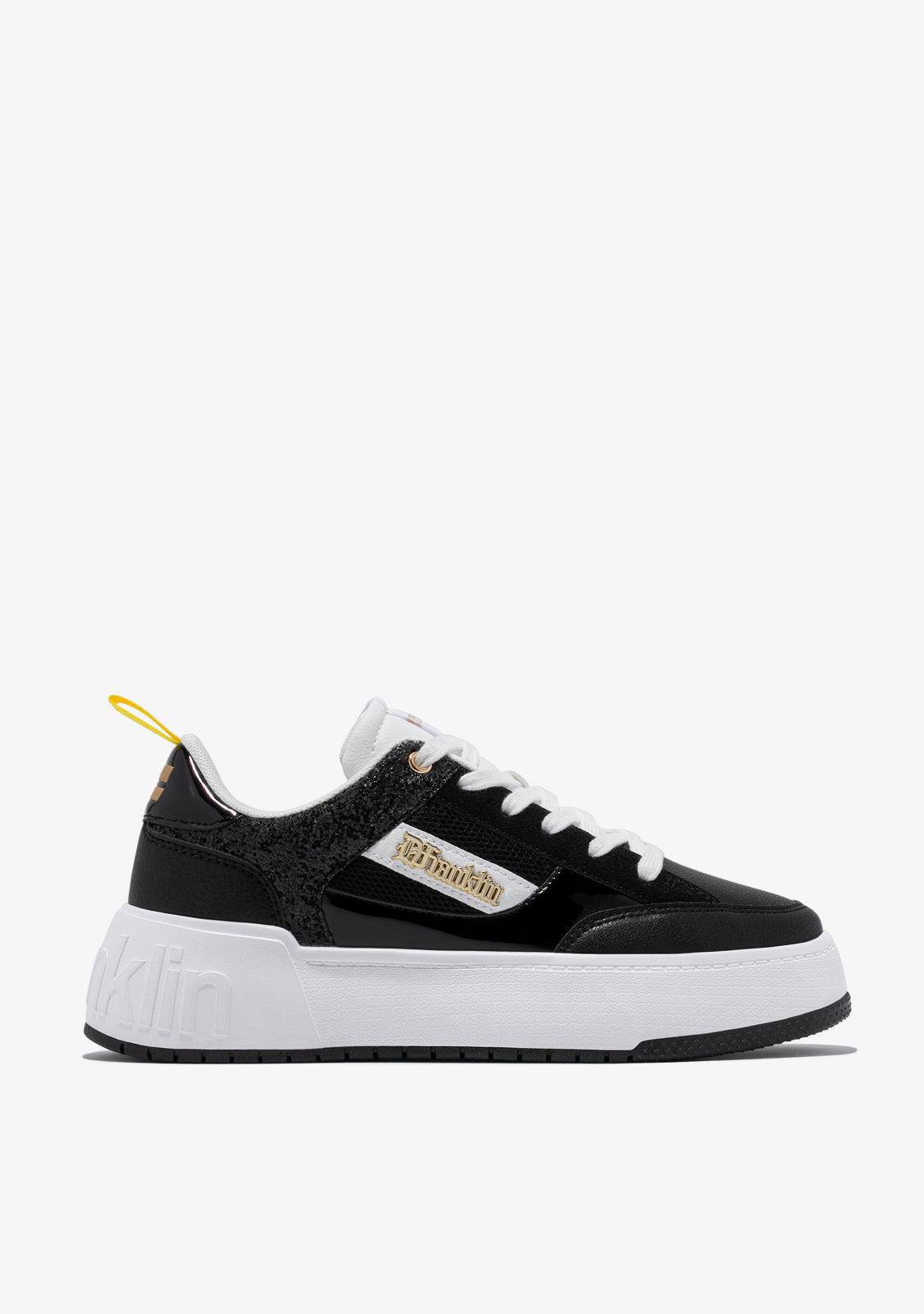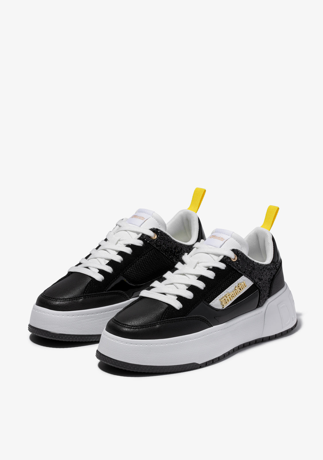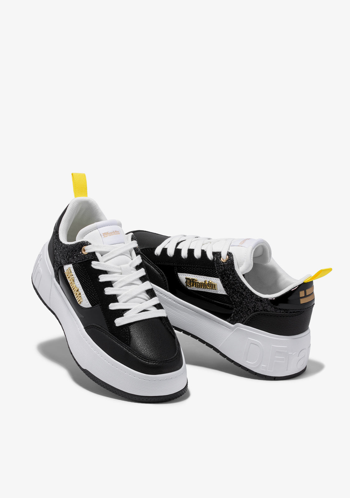 Dizajnirane da vrate adrenalin našeg ikoničnog Court modela. Inspirirane '90-ima i trendom košarke. S crnim šljokicama za redefiniranje klasike. Ikonični D.Franklin emblem u zlatnoj boji na bijelom veganskom sintetičkom kožom. Izrađene s gumenim potplatom. Ugravirani D.Franklin logo na peti. Pamuk vezice. Potplat od 4 cm.