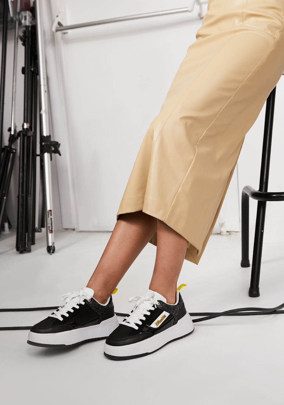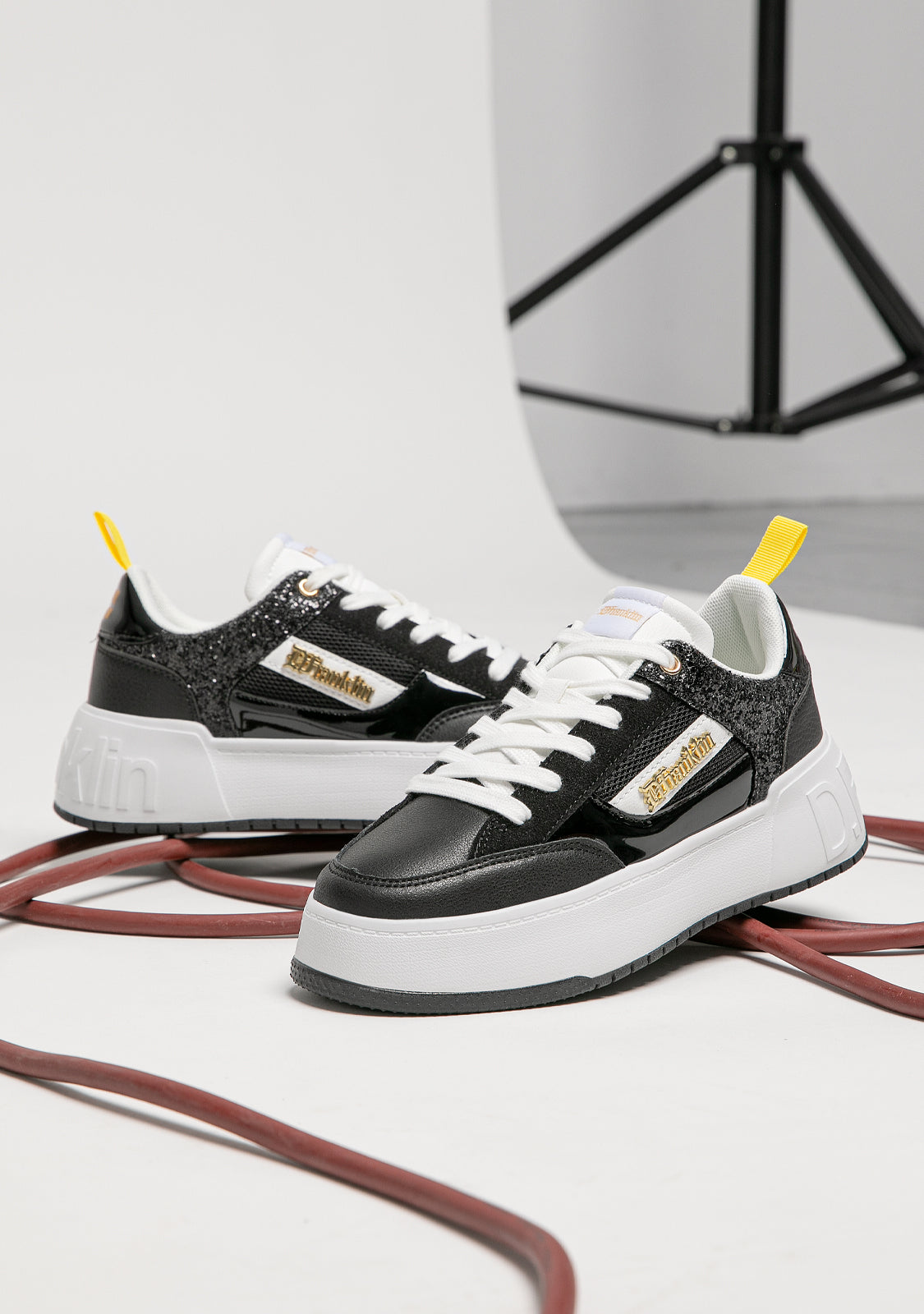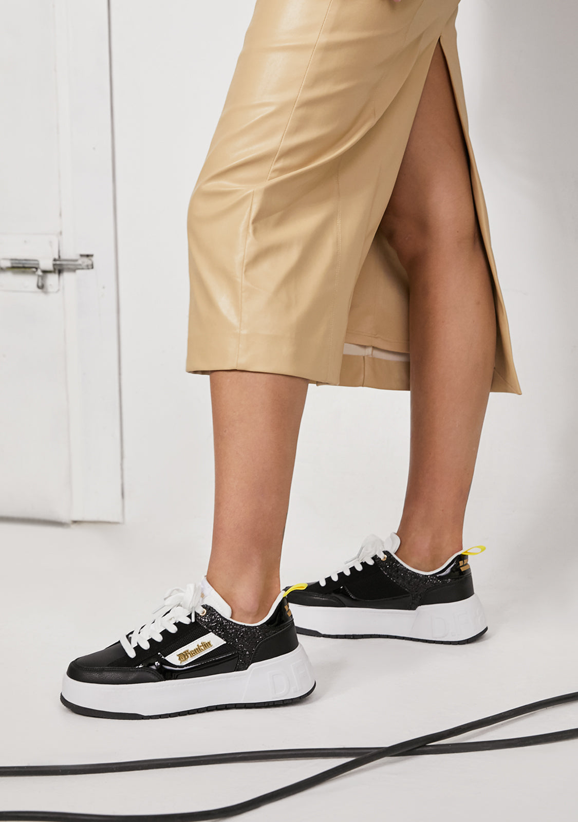 Dizajnirane da vrate adrenalin našeg ikoničnog Court modela. Inspirirane '90-ima i trendom košarke. S crnim šljokicama za redefiniranje klasike. Ikonični D.Franklin emblem u zlatnoj boji na bijelom veganskom sintetičkom kožom. Izrađene s gumenim potplatom. Ugravirani D.Franklin logo na peti. Pamuk vezice. Potplat od 4 cm.