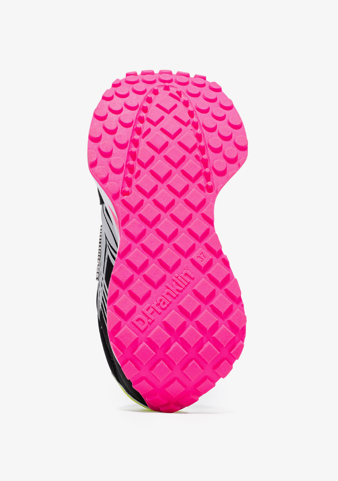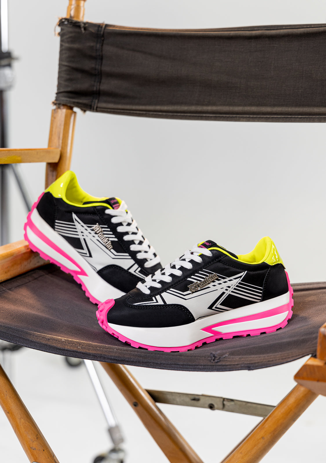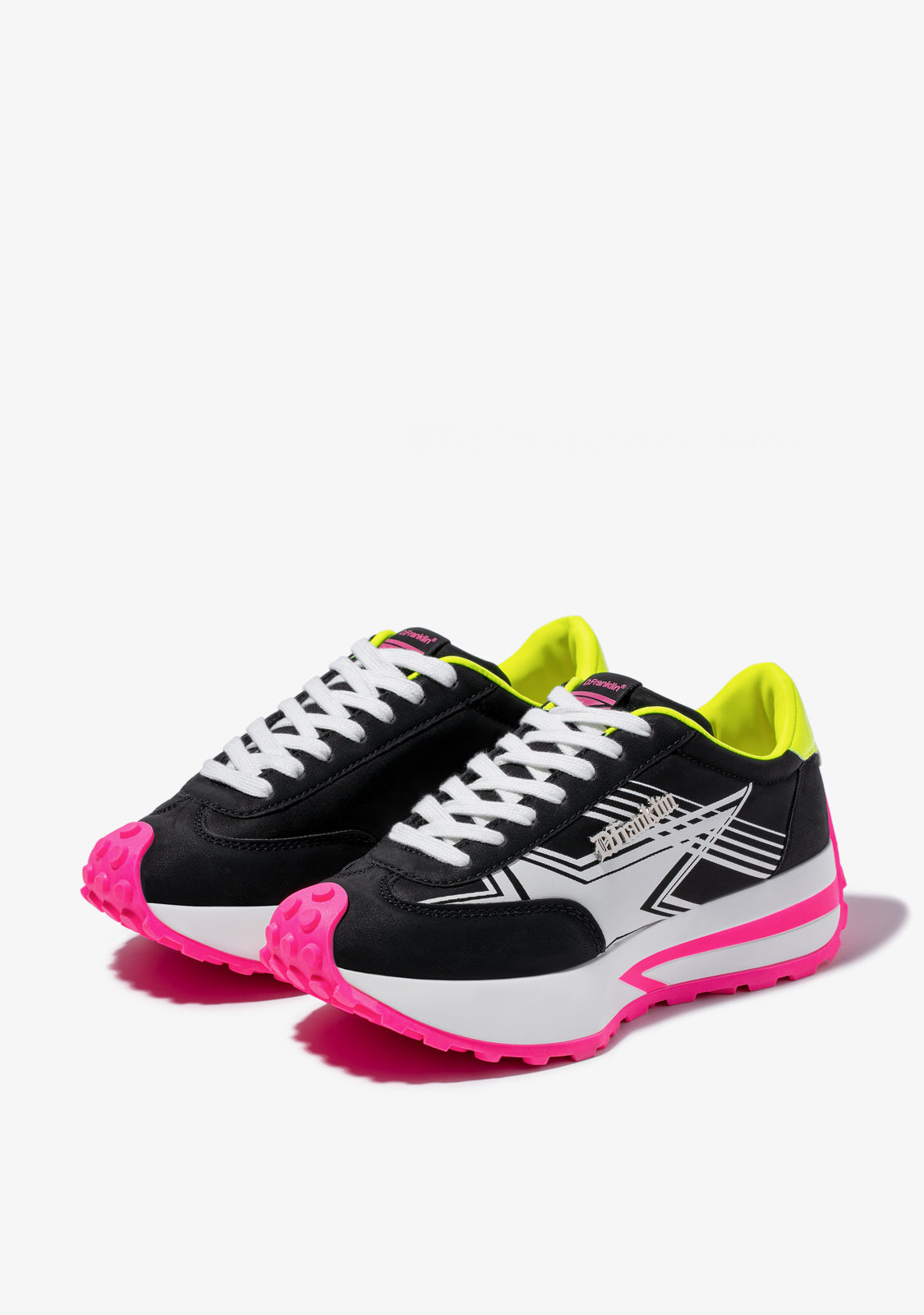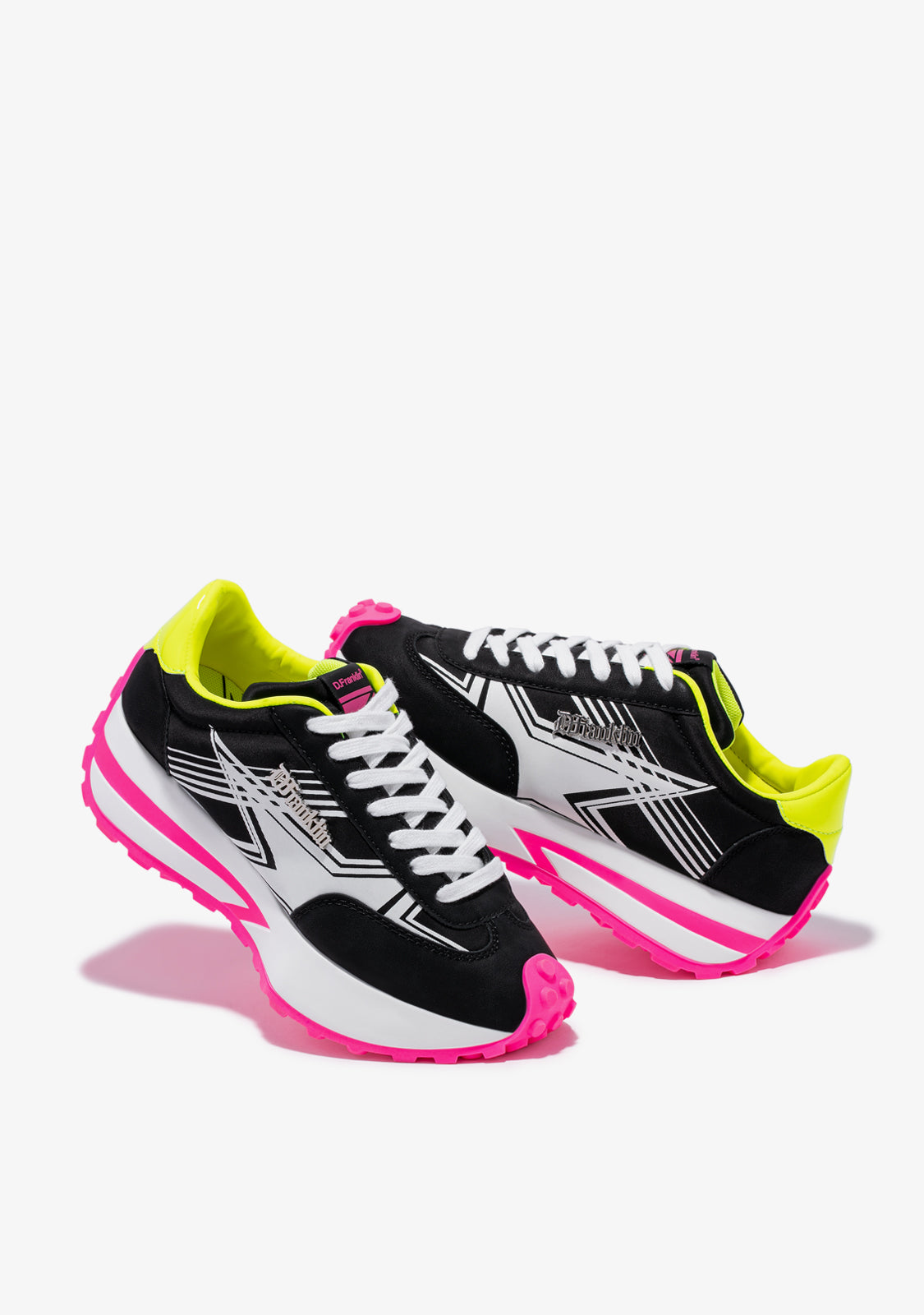 Tenisice inspirirane ritmom grada. Modni dizajn izrađen od materijala bez okrutnosti. Print zvijezde sa strane u bijeloj boji. Metalni detalj D.Franklin s platinom. 4 cm bijela platforma. Posebna neklizajuća TR potplat u fuksiji.