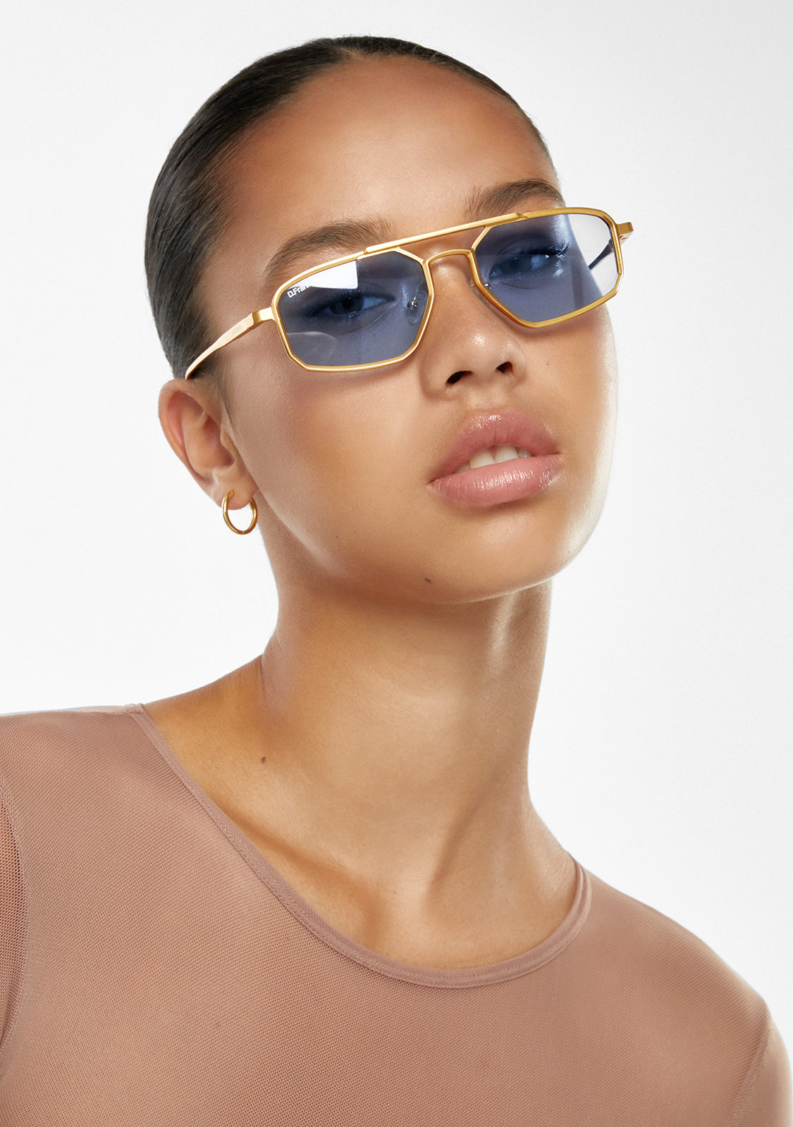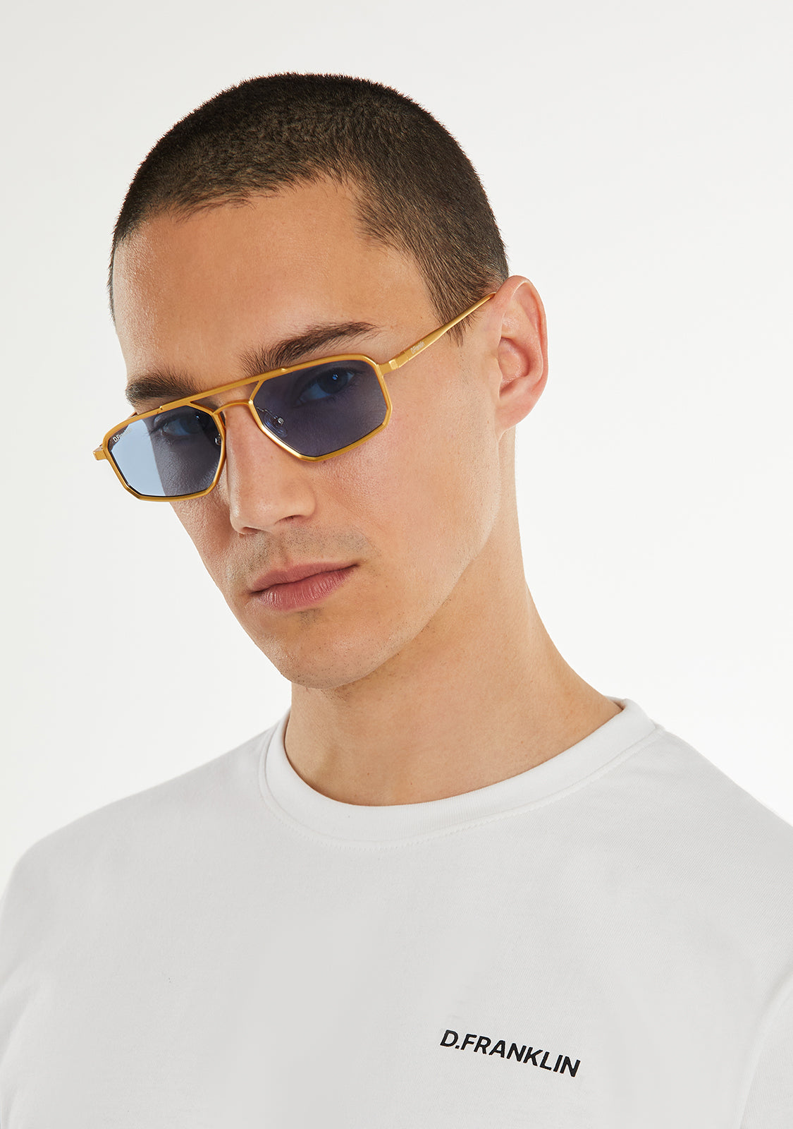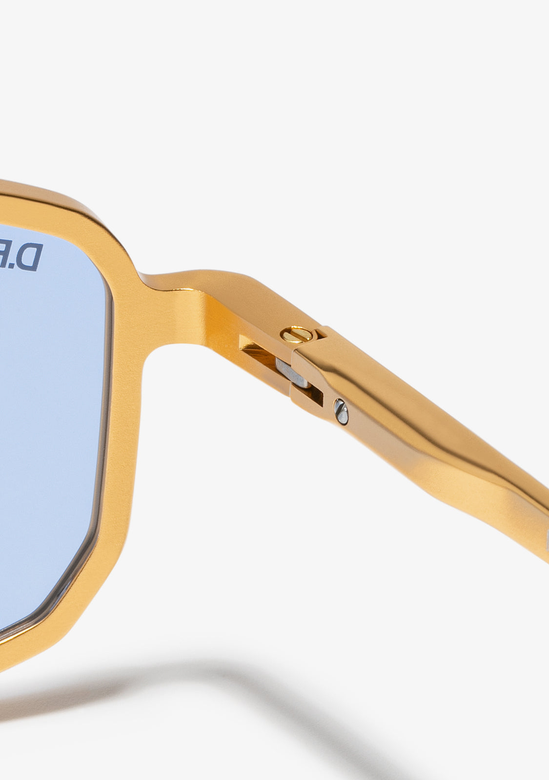 Zahvaljujući svojoj aluminijskoj konstrukciji, ove naočale su ultra lagane. Imaju plave polarizirane leće i mat zlatni okvir za prepoznatljivu estetiku. Dizajn sadrži naš grb na desnoj leći i metalni logo sa strane sljepoočnica. Ima okvir širine 143 mm i širinu leće od 52 mm, što odgovara većini lica. Sljepoočnice su duge 138 mm.