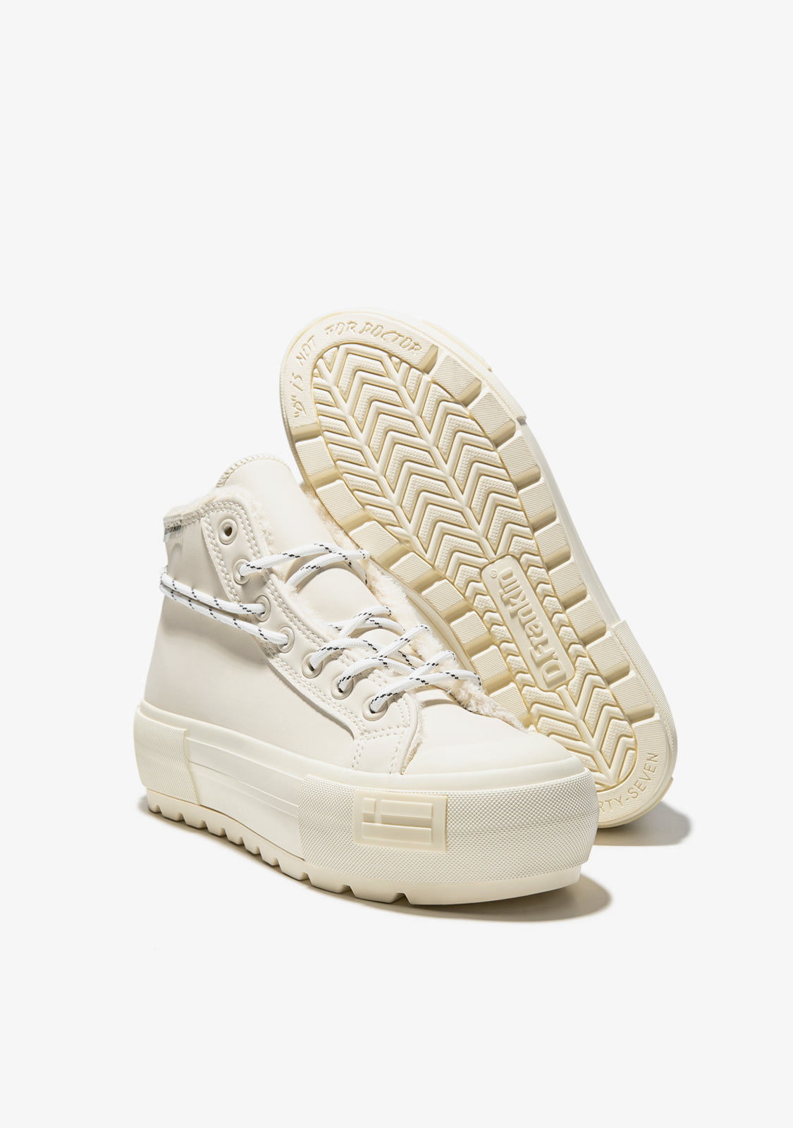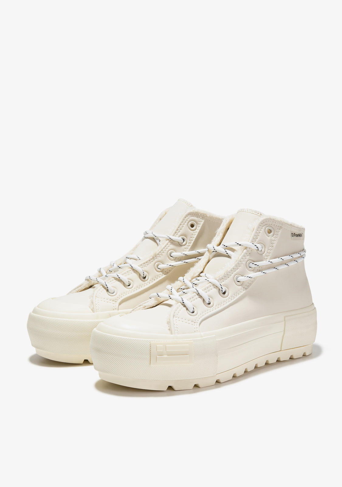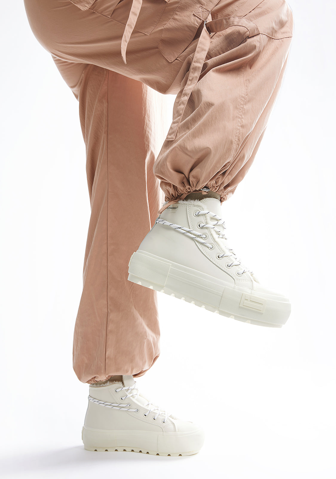Naše tenisice s krznom spajaju udobnost i toplinu u bež toniranoj čizmi. Višenamjenske vezice za urbanu estetiku i savršeno pristajanje. Potplat od 5 cm sadrži naš emblem na peti i prednjem dijelu.
