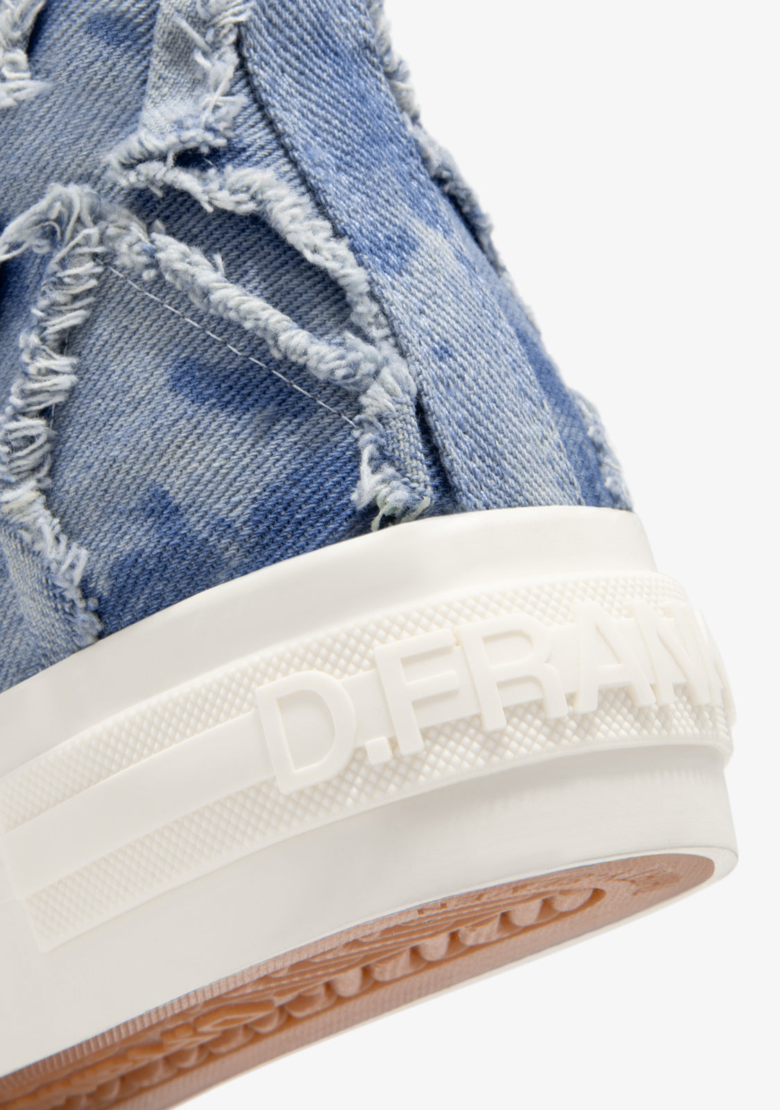 Ovaj model visokog kroja ima izlizani izgled u plavoj nijansi i denim teksturi. Bijela gumena potplata visoka je 4 cm. Također sadrži personalizirano slovo na peti.