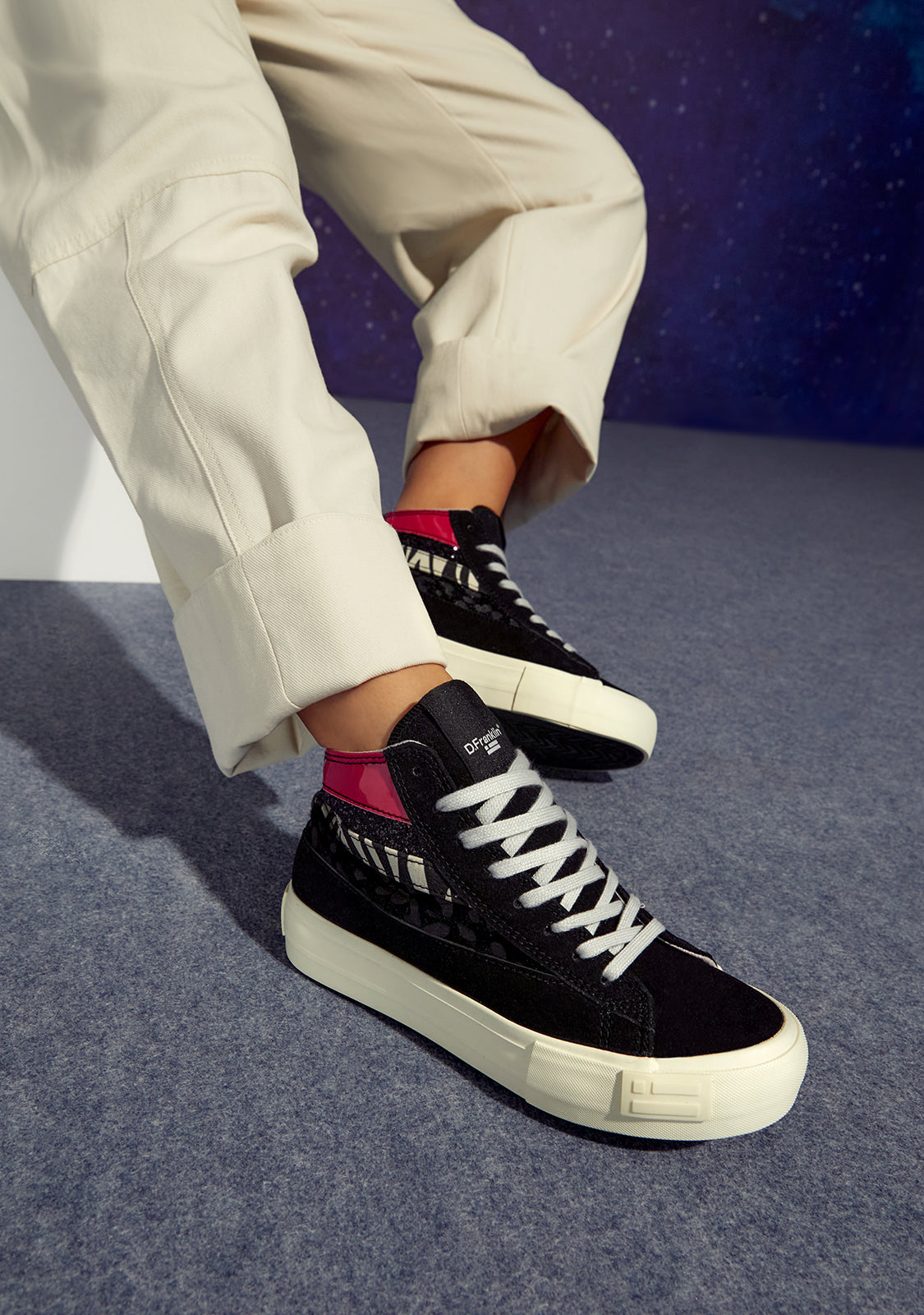 Visoke D.Franklin tenisice dizajnirane s hrabrom kombinacijom materijala i tekstura. Defiantna ponuda za prekid s konvencionalnošću i ostavljanje traga s svakim korakom.