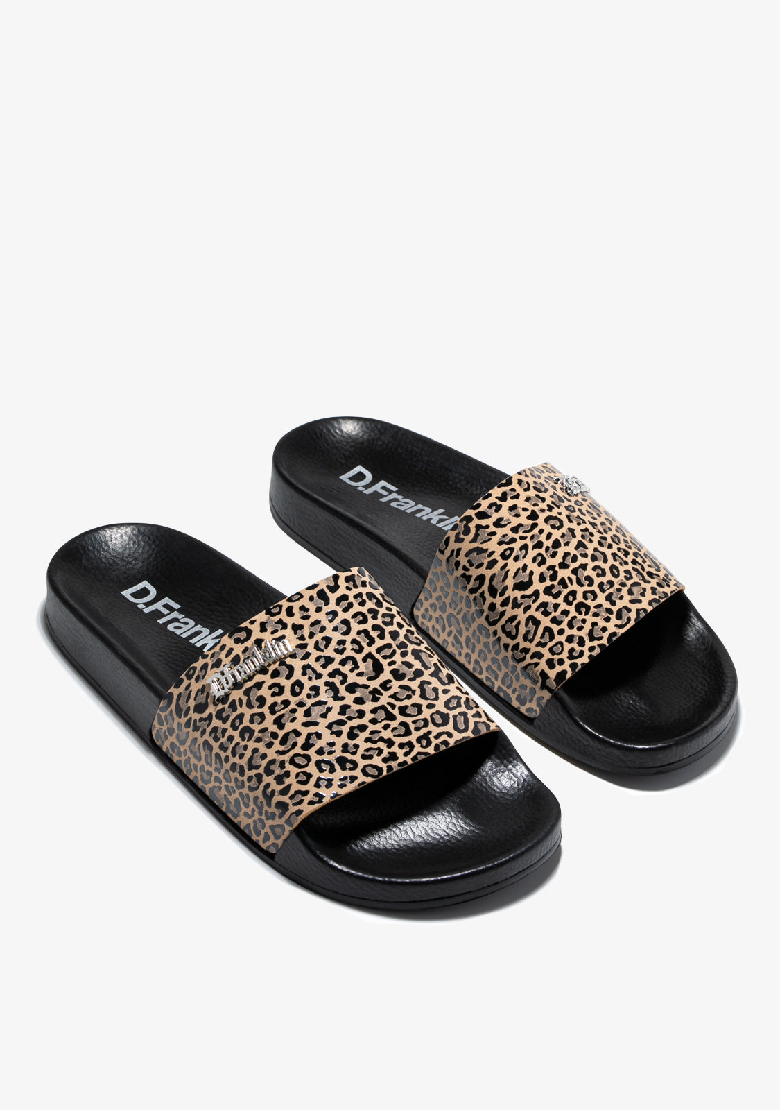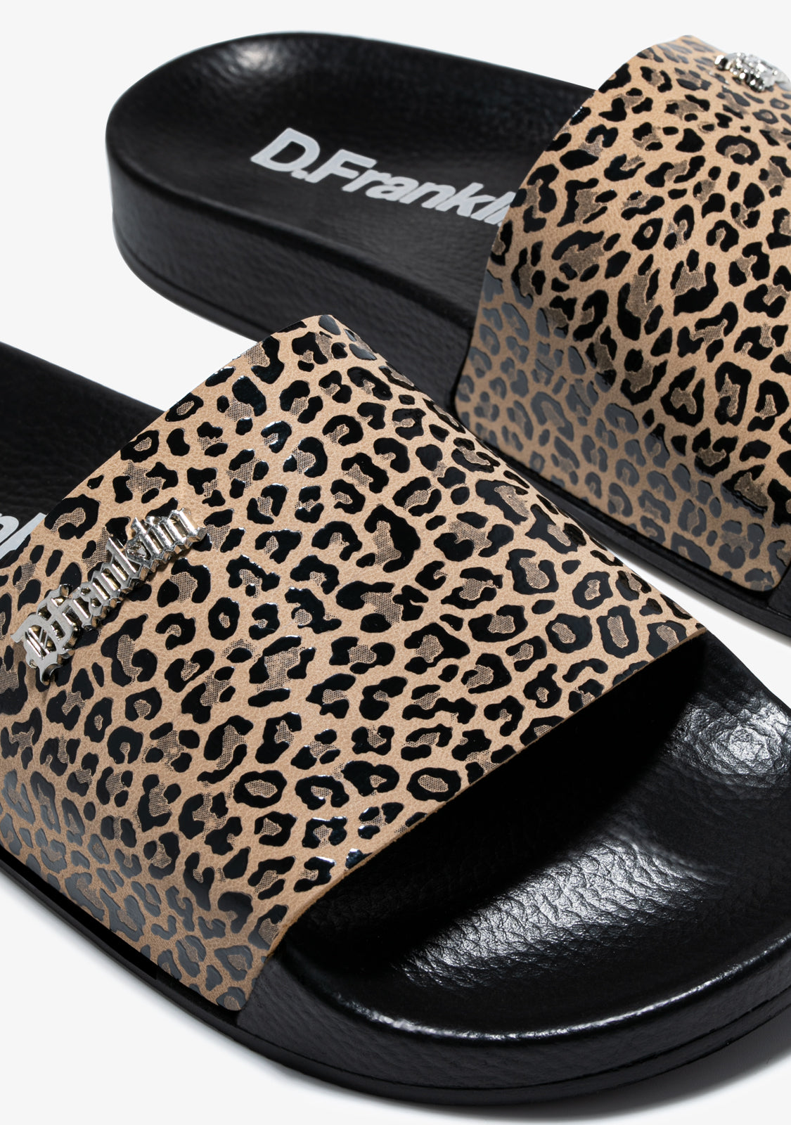 D.Franklin Pala Slide Patent sandale imaju široku sintetičku traku s leopard uzorkom za sigurno prianjanje. Također imaju naš D.Franklin emblem na gornjem dijelu. Dizajn uloška je oblikovan da savršeno odgovara obliku stopala.