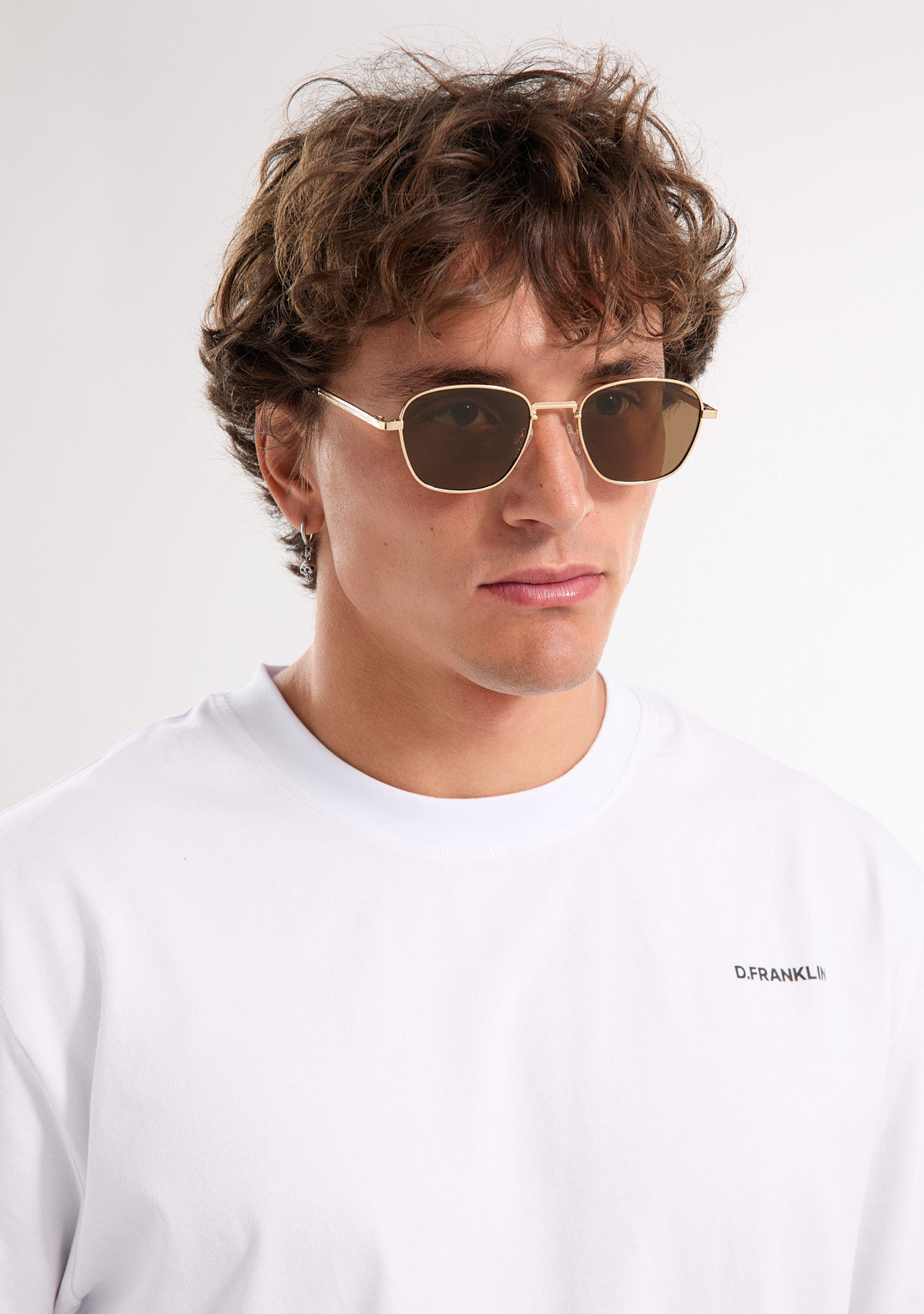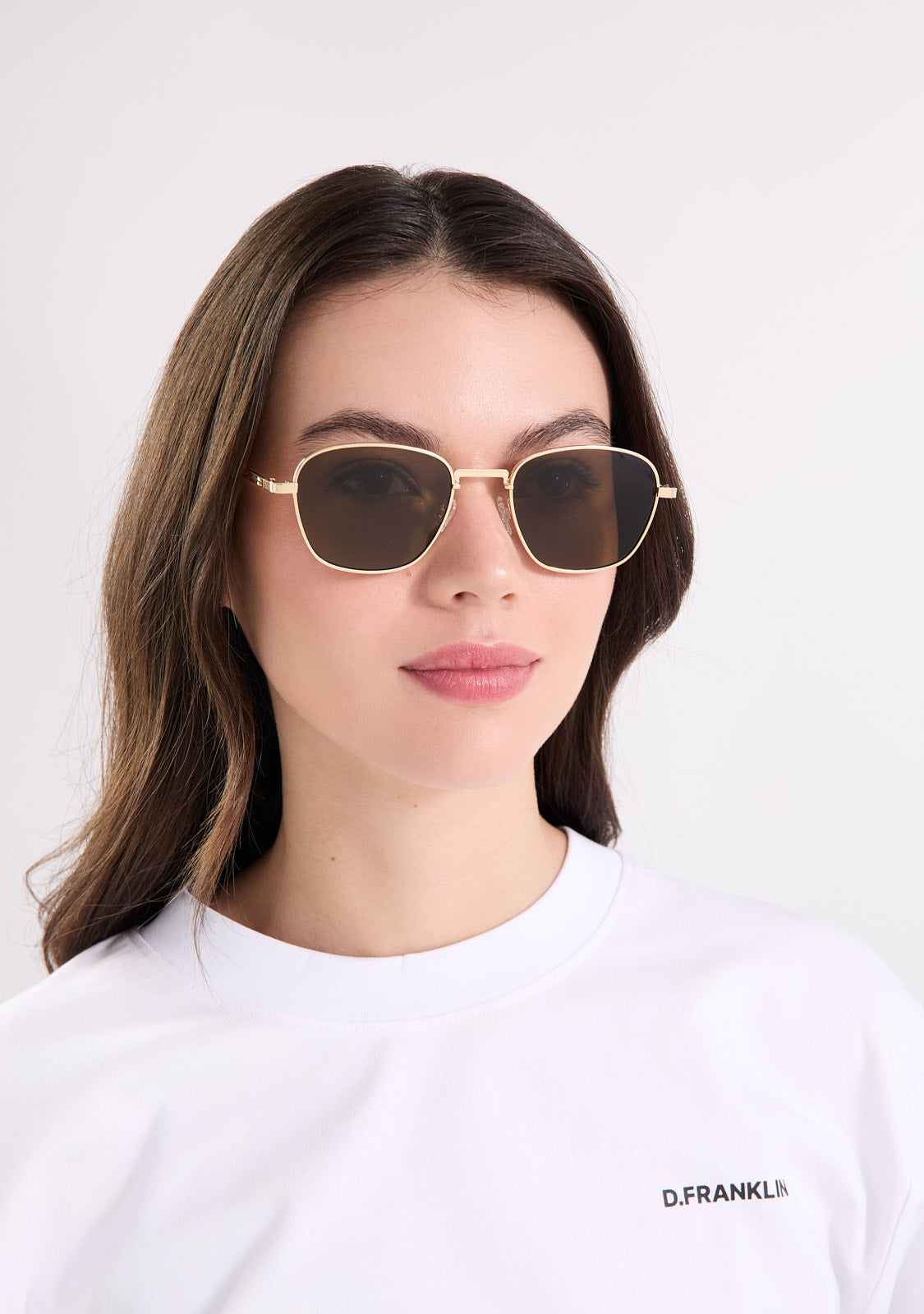 Quad Legacy Gold / Brown sunčane naočale marke D.Franklin ističu se svojim bezvremenskim dizajnom, izrađene od visokokvalitetnih materijala za udobno i izdržljivo svakodnevno nošenje. Metalni okvir osigurava i čvrstoću i laganost, dok polikarbonatne leće pružaju potpunu UV zaštitu.