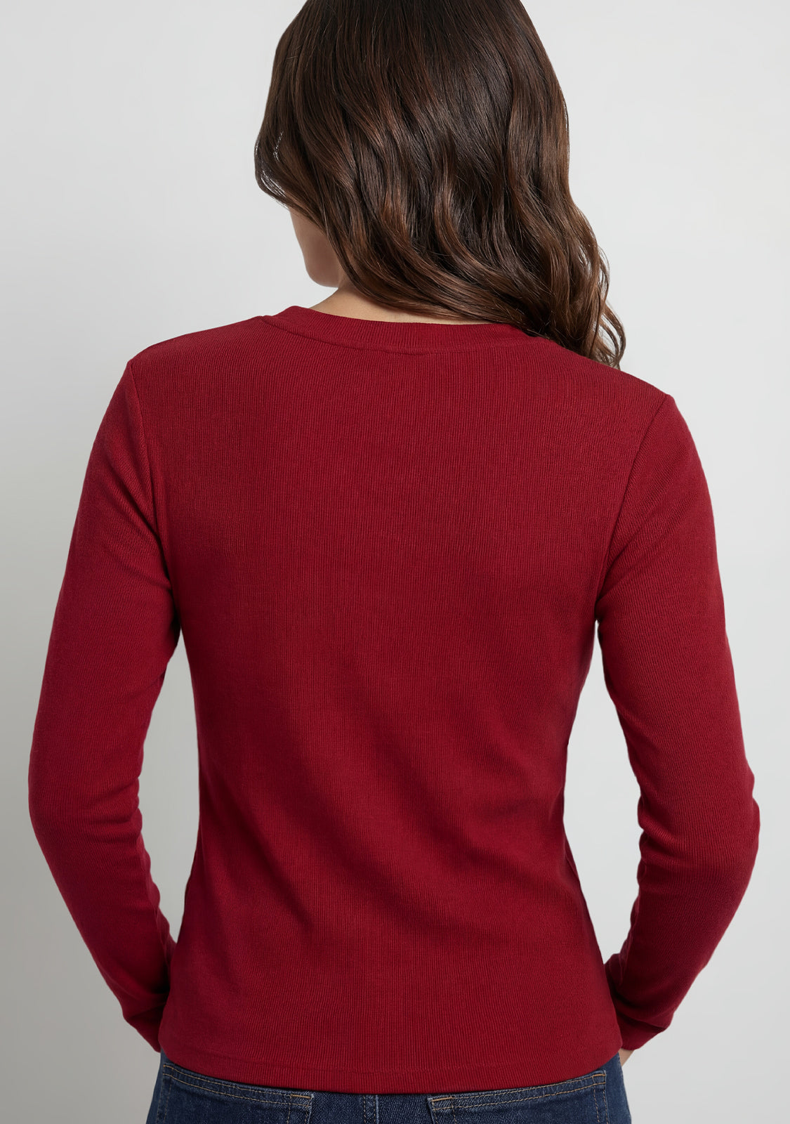 Rib Long Sleeve Top Burgundy od D.Franklina je majica s dugim rukavima koja se ističe svojim modernim i elegantnim dizajnom. Izrađena od 94% pamuka i 6% spandexa, te s težinom od 280 gsm, ovaj odjevni predmet je mekan i lagan, savršen za održavanje udobnosti tijekom cijelog dana.