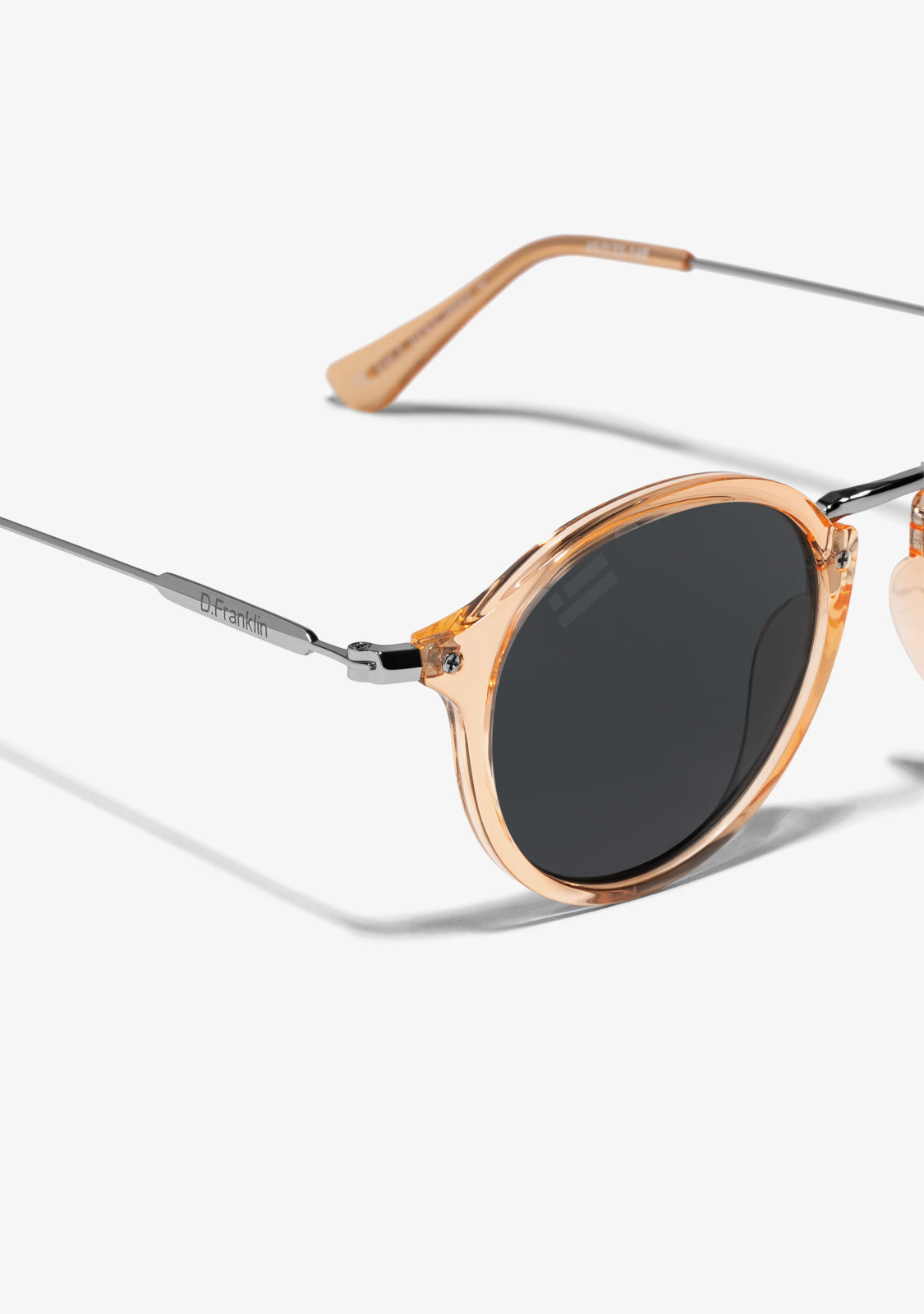 Zaobljene leće u sivoj nijansi i okvire u boji jantara pojačavaju estetiku sedamdesetih ovog modela. Sadrži naše prepoznatljive D.Franklin detalje: logo ugraviran na oba metalna sljepoočnica i naš emblem na desnoj leći. S širinom leće od 49mm i širinom okvira od 148mm, ove naočale će laskati većini lica. Bočne sljepoočnice su duge 145mm.