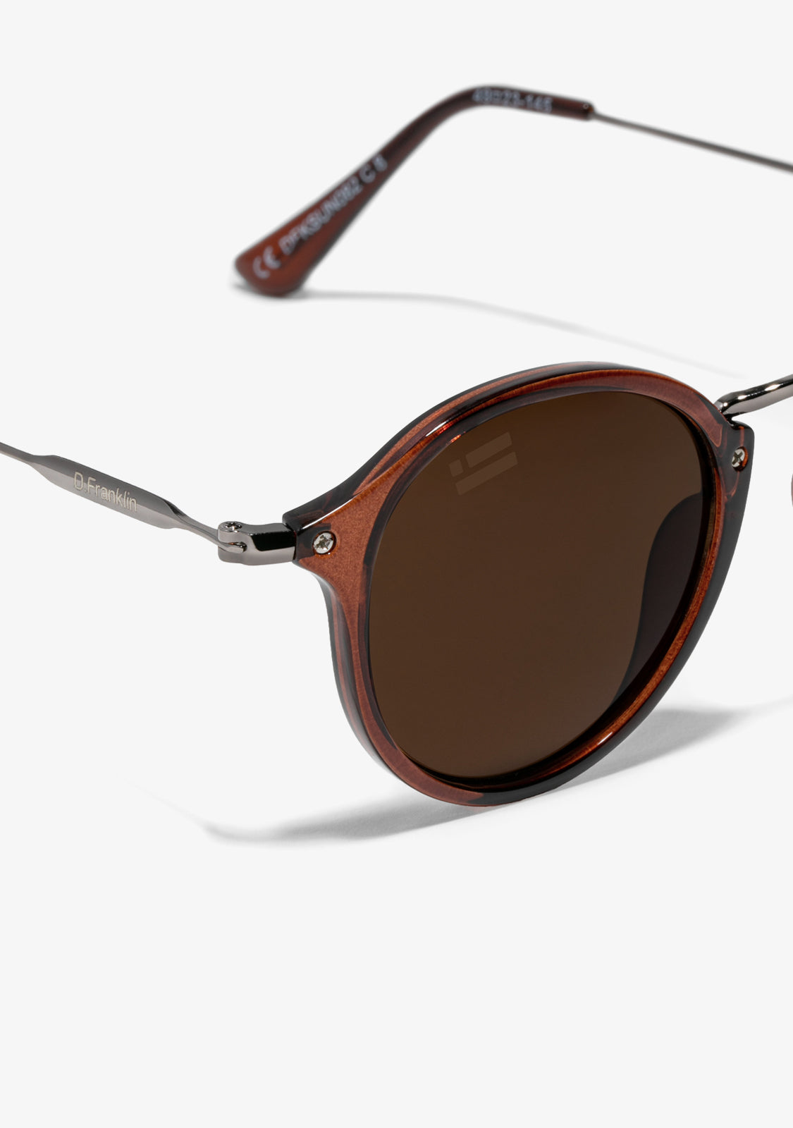 Zaobljene smeđe leće i smeđi okviri pojačavaju estetiku sedamdesetih ovog modela. Sadrži naše prepoznatljive D.Franklin detalje: logo ugraviran na oba metalna stuba i naš emblem na desnoj leći. S širinom leće od 49mm i širinom okvira od 148mm, ove naočale će laskati većini lica. Bočni stubovi su dugi 145mm.
