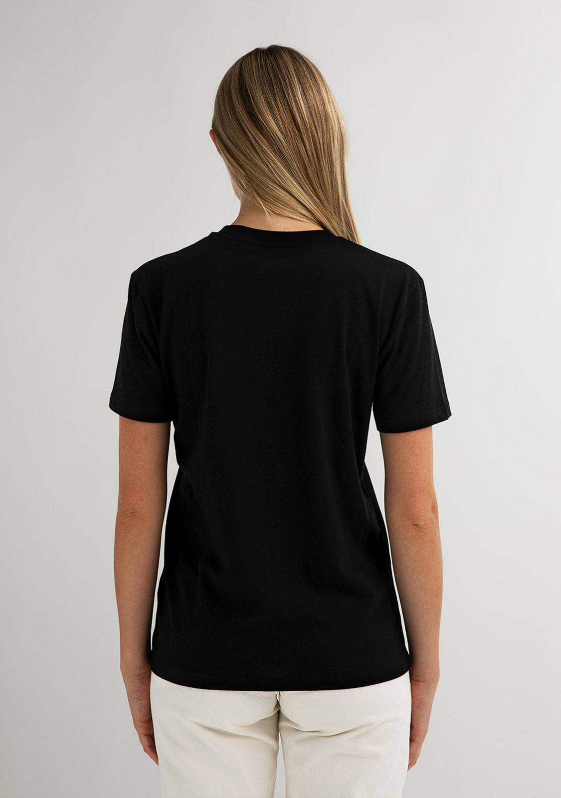 Crna majica kratkih rukava s bijelim D.Franklin logotipom. Prednja strana inspirirana američkim koledžima i bratstvima. Okrugli izrez s dvostrukim šavom. Izrađena od 100% organskog pamuka. Ženski model.