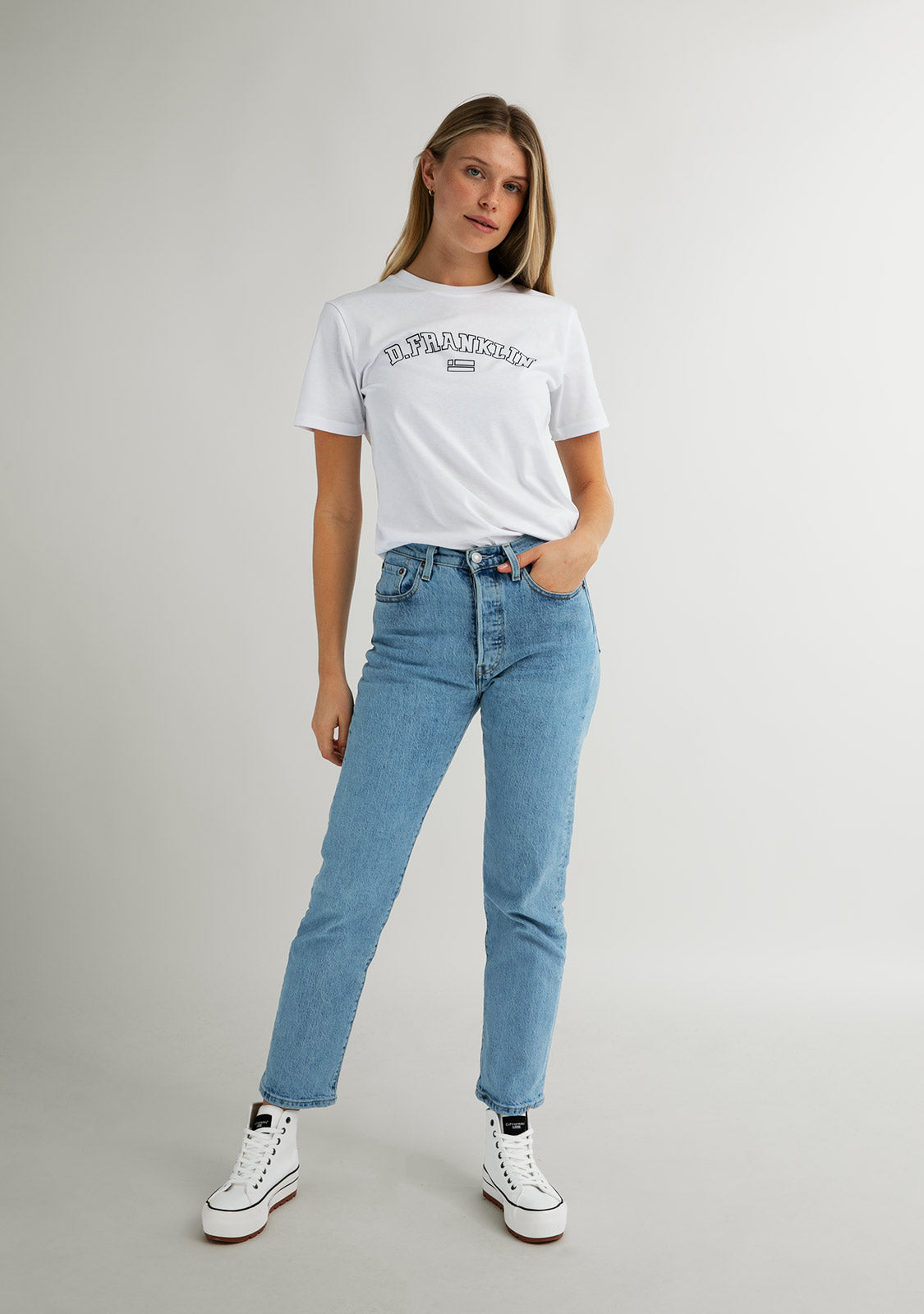 Bijela majica kratkih rukava s crnim D.Franklin logotipom. Prednja strana inspirirana američkim koledžima i bratstvima. Okrugli izrez s dvostrukim šavom. Izrađena od 100% organskog pamuka. Ženski model.